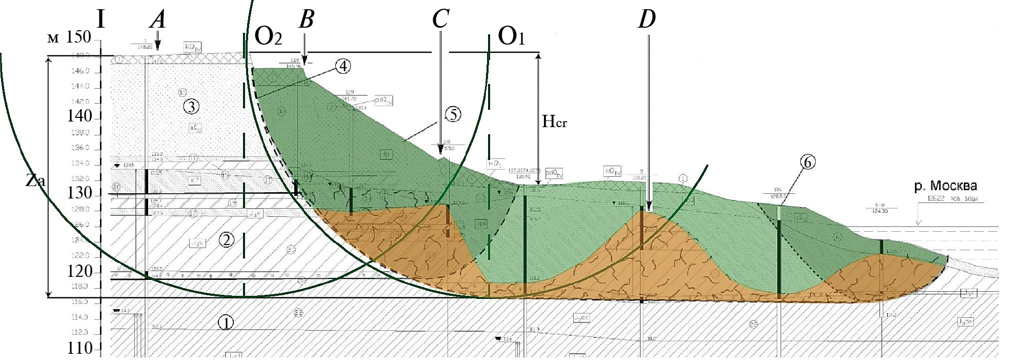 Рис. 4. Схематический инженерно-геологический разрез по центральному створу при образовании и отделении ДГС-блока на оползневом участке Хорошево (Москва). 1 и 2 – глины волжского и оксфордского ярусов юрской системы соответственно; 3 – пески четвертичных отложений; 4 – круговая поверхность скольжения в оболочке ДГС; 5 – отделившийся ДГС-блок; 6 – скважина. Границы ДГС-блоков показаны, как дуги окружности радиусом Zа, зелеными линиями. A, B, C, D – индикаторы проявления ДГС.