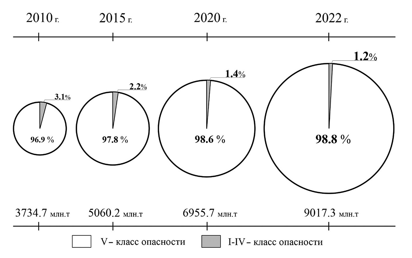 Рис. 1. Образование отходов производства и потребления по классам опасности в России, млн т [составлен авторами на основе данных 1, 10, 13].