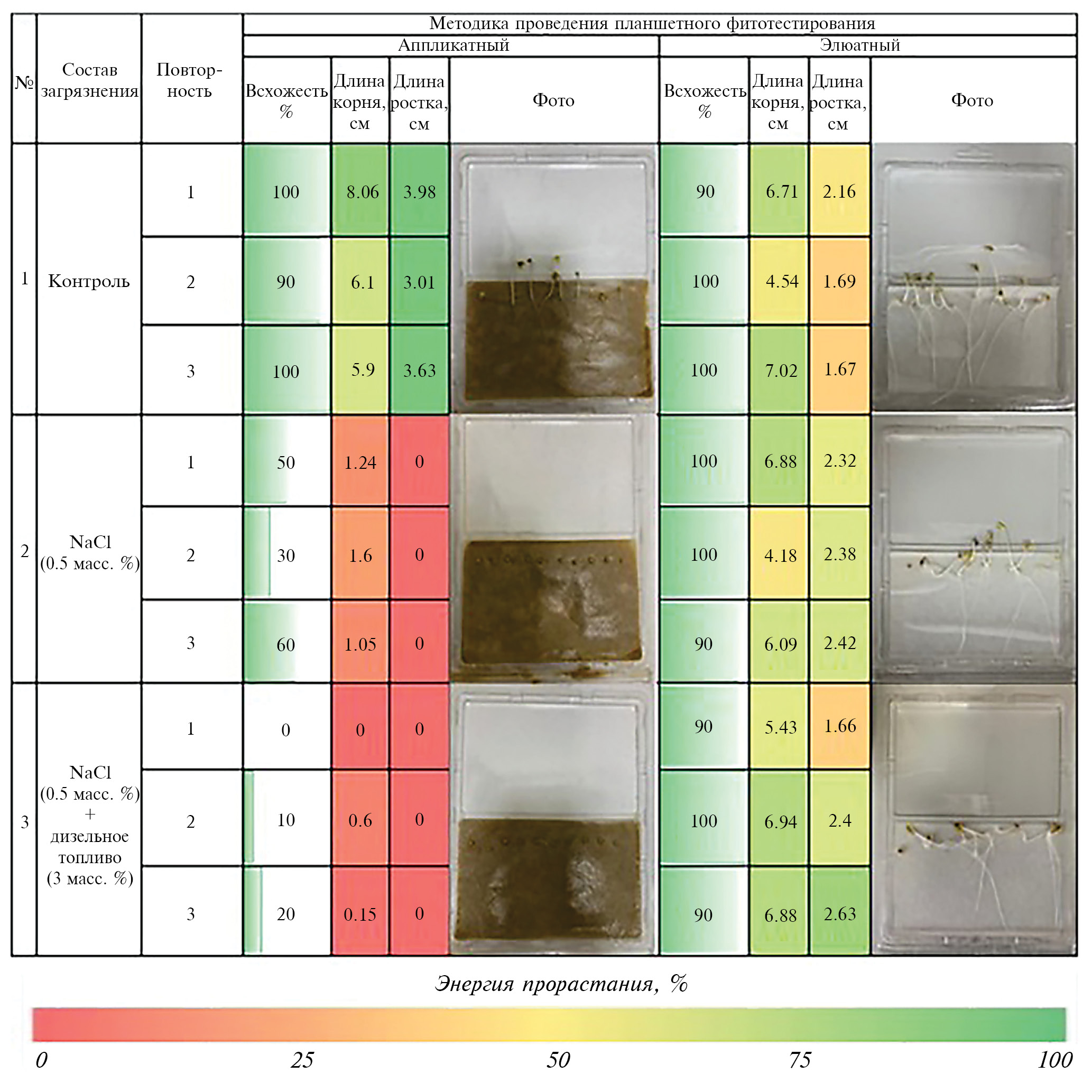 Результаты, полученные с применением апликатного и элюатного вариантов тестирования (см. рис. 9), ярко продемонстрировали существенные различия оценок, когда при выбранных заведомо токсичных концентрациях загрязнителя по элюатному варианту эксперимента не удалось обнаружить наличия токсического эффекта на двудольную культуру − Sinapis alba (горчицу белую).