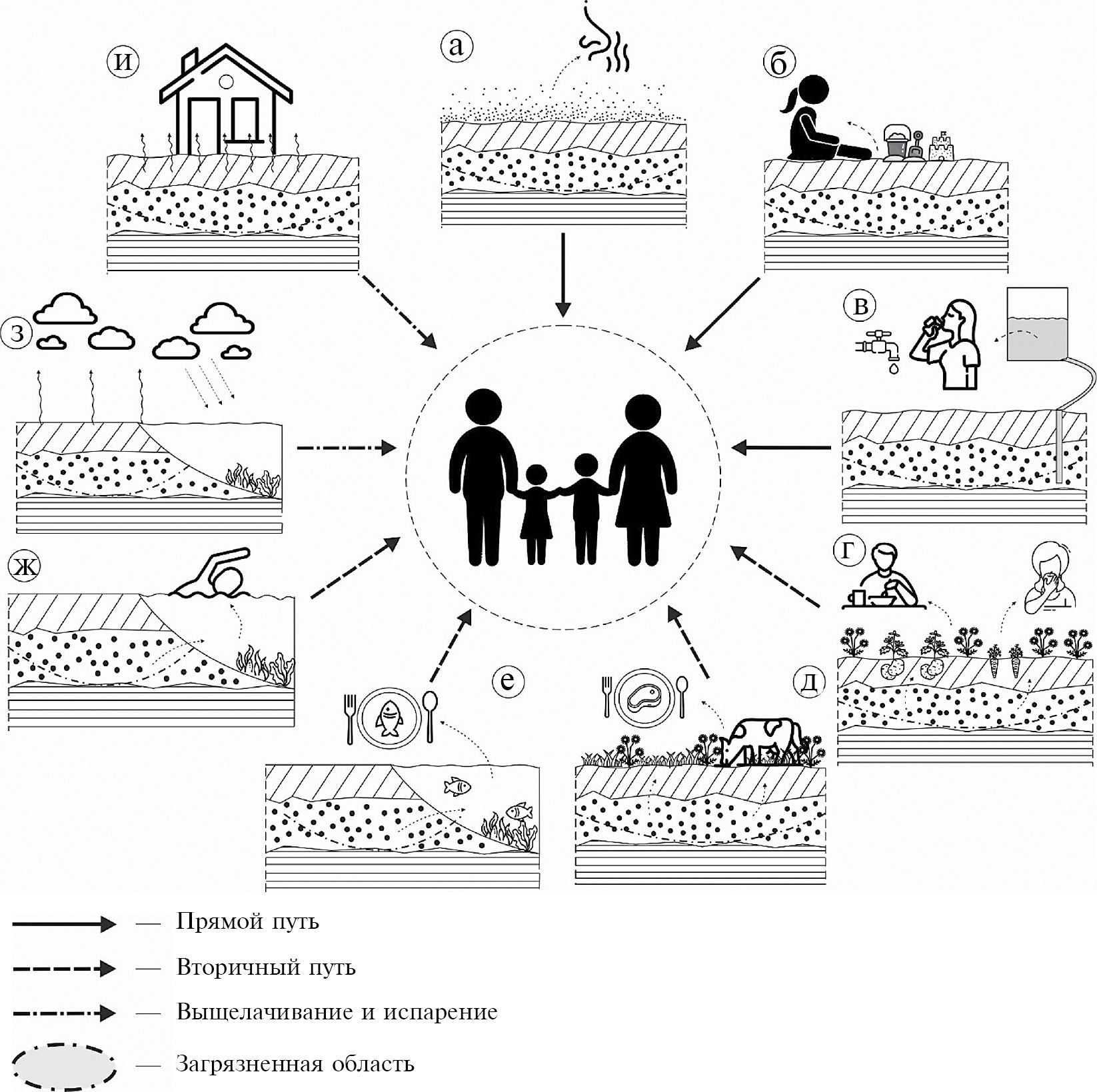 Вторичный или косвенный путь заключается в употреблении человеком в пищу растений, мяса животных и рыб (см. рис. 7г, д, е), которые контактировали с загрязняющими веществами в среде своего обитания или питались загрязненной пищей. Наличие в области проникновения загрязнения в грунтовую толщу водоносного горизонта, разгружающегося в открытый водоем, также приводит к возможности реализации косвенного пути при контакте кожи человека с загрязненными поверхностными водами (см. рис. 7ж). Третий сценарий попадания загрязняющих веществ в организм человека заключается во включении этих соединений в круговорот воды и их перенос на ранее незагрязненные участки (см. рис. 7з), а также попадании паров, содержащих летучие токсичные соединения, в жилые здания и постройки (см. рис. 7и).