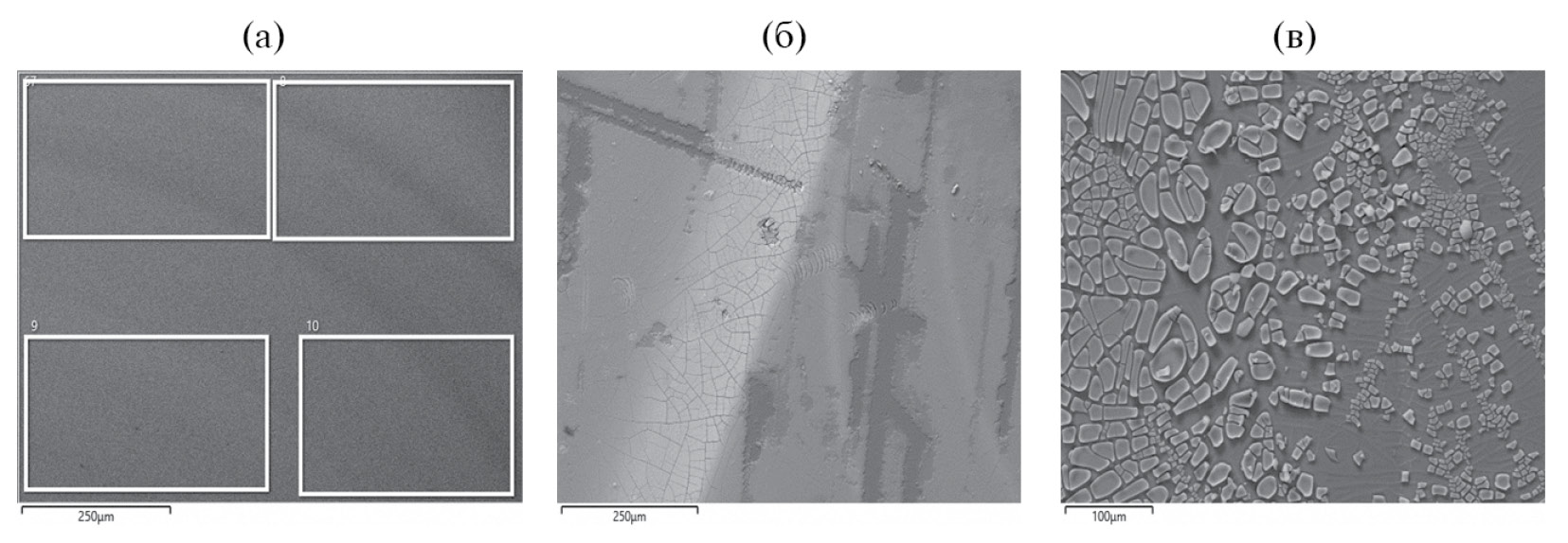 Рис. 1. СЭМ-изображение стекла до (а − показаны площадки ЭДС анализа) и после (б, в) его контакта с дистиллированной (б) и бентонитовой (в) водой при 90°С в течение 14 сут.