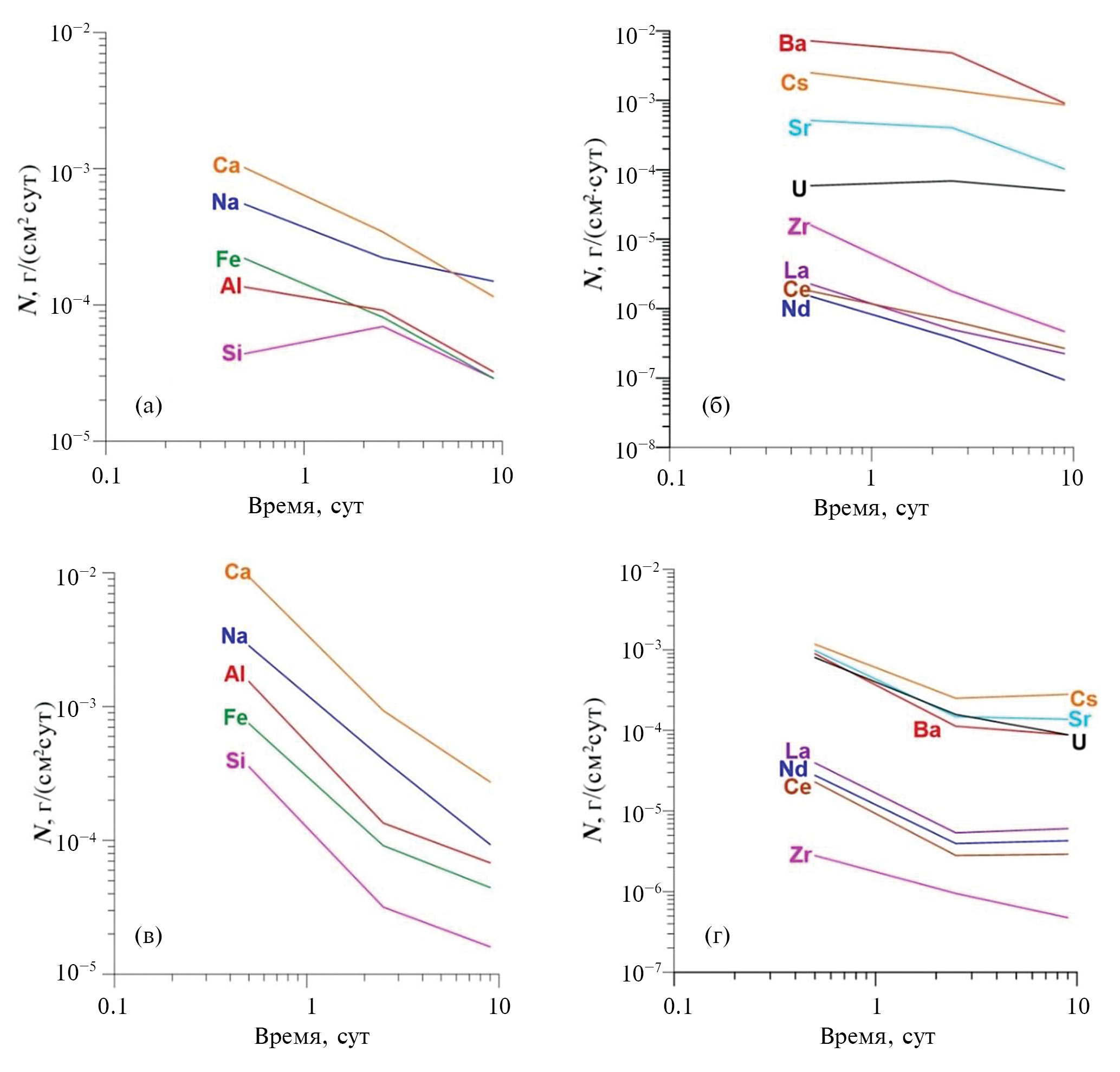 где Ci – массовая концентрация элемента в растворе, V – объем раствора, S – площадь образца, t – время контакта стекла и раствора, f – массовая доля элемента в стекле. Вычисленные скорости выщелачивания на каждом интервале времени между заменами воды отнесены к серединам этих интервалов. Для элементов матрицы (рис. 2а, в) значения Ni снижаются от Na и Ca к Al, Fe и Si. В бентонитовой воде значения на порядок выше. Скорости выщелачивания имитаторов радионуклидов в опытах длительностью 14 сут снижаются на порядок (см. рис. 2б, г) из-за уменьшения интенсивности взаимодействия стекла и раствора, вероятно в связи с появлением экранирующего поверхностного гелевого слоя.