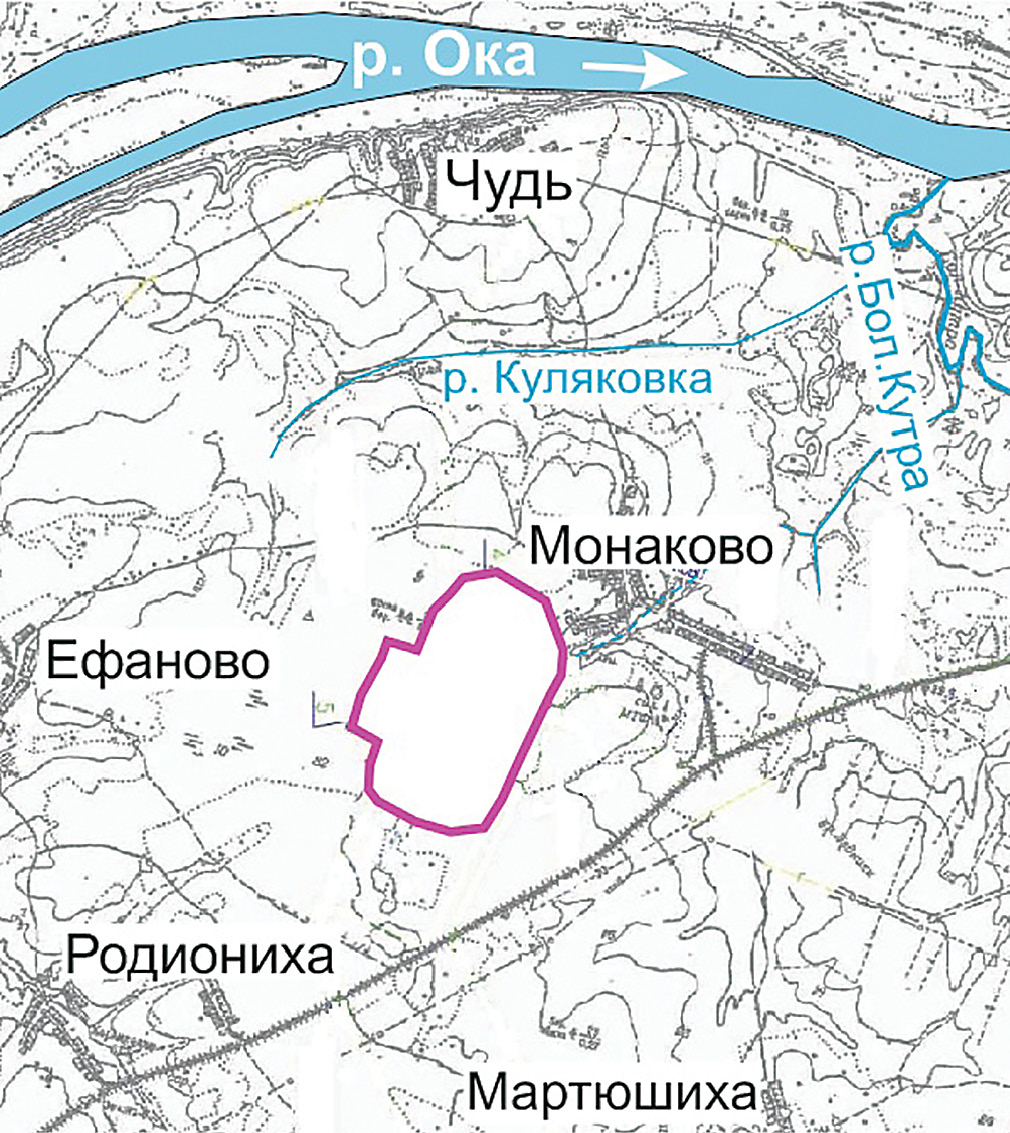 В результате долгих и скрупулезных комплексных изысканий, выполненных проектным институтом ОАО “НИАЭП” и рядом привлеченных научно-исследовательских и производственных организаций, с трудом выделен участок площадью Sо = 3.25 км2, где проявления карста на земной поверхности отсутствуют. Эта площадка, предназначенная для строительства главных сооружений, расположена на правом берегу р. Ока в 3-х км южнее нее и в 1м км западнее палеовреза р. Бол. Кутра на абс. отм. 110−130 м. Ближайшие населенные пункты: с. Монаково, с. Ефаново, д. Родиониха, д. Мартюшиха, с. Чудь (рис. 1).