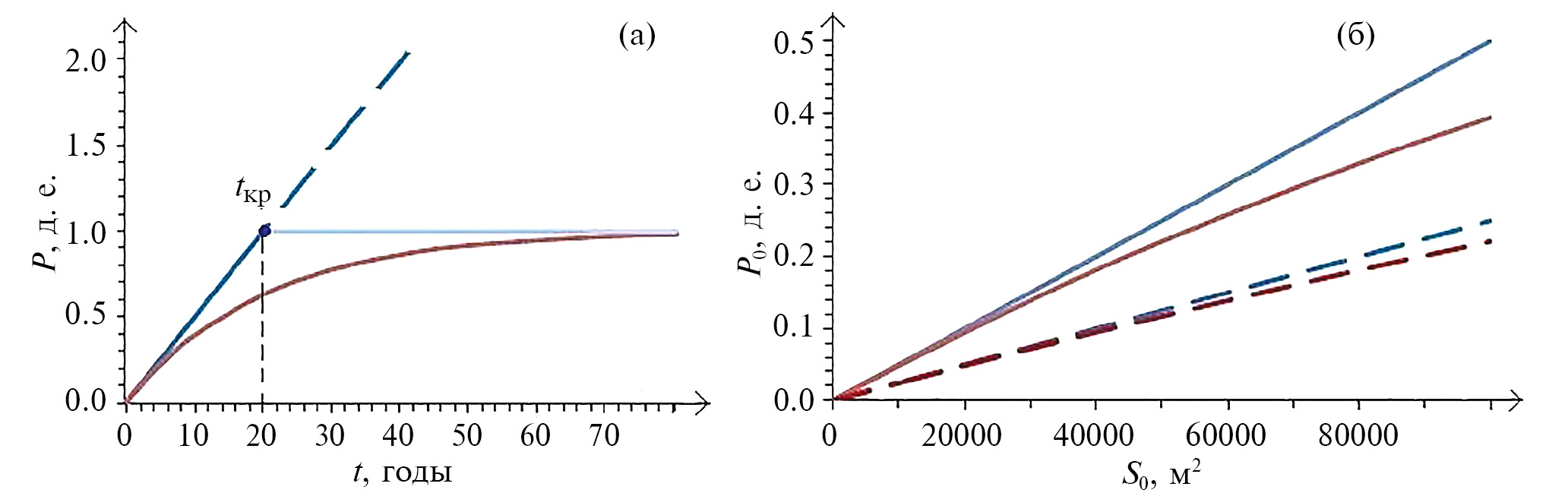 На рис. 2а показаны результаты вычисления вероятности образования хотя бы одной воронки на территории S согласно (6), (8), в которых Ps = Sо / S = 1, То = t. Видно, что при λ*t < 0.25 (t < 5 лет для принятой на рисунке частоты λ* = 0.05 год–1) значения P практически совпадают: их разность ∆P = (P6 – P8) < 3%. Однако в отличие от экспоненциальной зависимости линейная функция (6), по сути дела, показывает рост числа провалов во времени: P = λ*t = n. И при достаточно большом значении t может оказаться, что P > 1 даже при очень малой частоте процесса. На рис. 2а таким критически большим значением времени служит tкр = 20 лет.