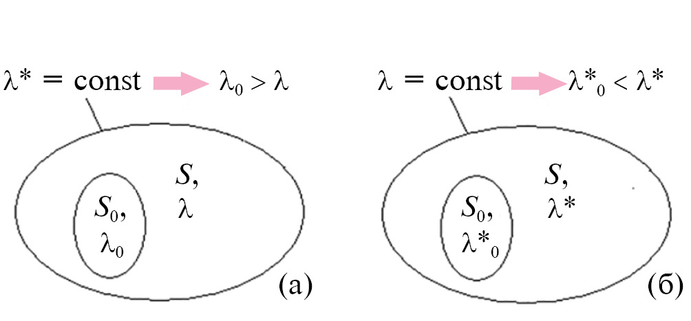 Рис. 4. Соотношение интенсивности λ и частоты λ* провалов на оцениваемом участке (объекте) So и всей территории S, ограниченной изолиниями λ* = const (а) и λ = const (б).