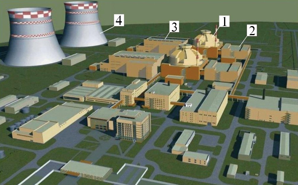 Рис. 5. Макет энергоблоков Нижегородской АЭС: 1 − реакторное здание, 2 – вспомогательное реакторное здание, 3 – здание турбины, 4 – башенная испарительная градирня (по материалам ОАО НИАЭС).