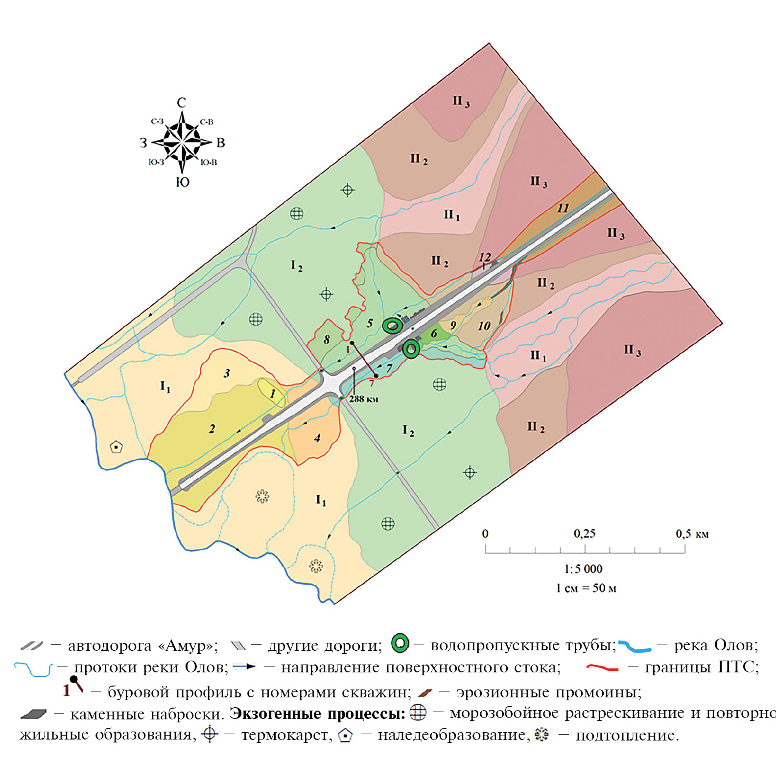 В районе исследования 288 км автодороги “Амур” проведены ландшафтно-геокриологические исследования и составлена карта-схема (рис. 1), на которой выделены природные геосистемы на уровне сложных урочищ, а также производные геосистемы, соответствующие зоне влияния ПТС с указанием ведущих процессов.