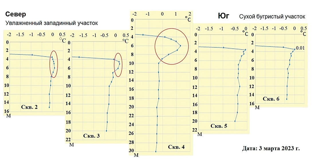 Нарушение поверхностного стока и развитие термокарста отразилось на распределении температур в грунтах. На северном увлажненном участке положительные температуры грунтов прослеживаются на глубину 8–9 м (см. рис. 3, скв. 2, 3). На южном участке оттаивало не более 3–3.5 м (см. рис. 3, скв. 5, 6), т.е. глубина не превышала мощности деятельного слоя.