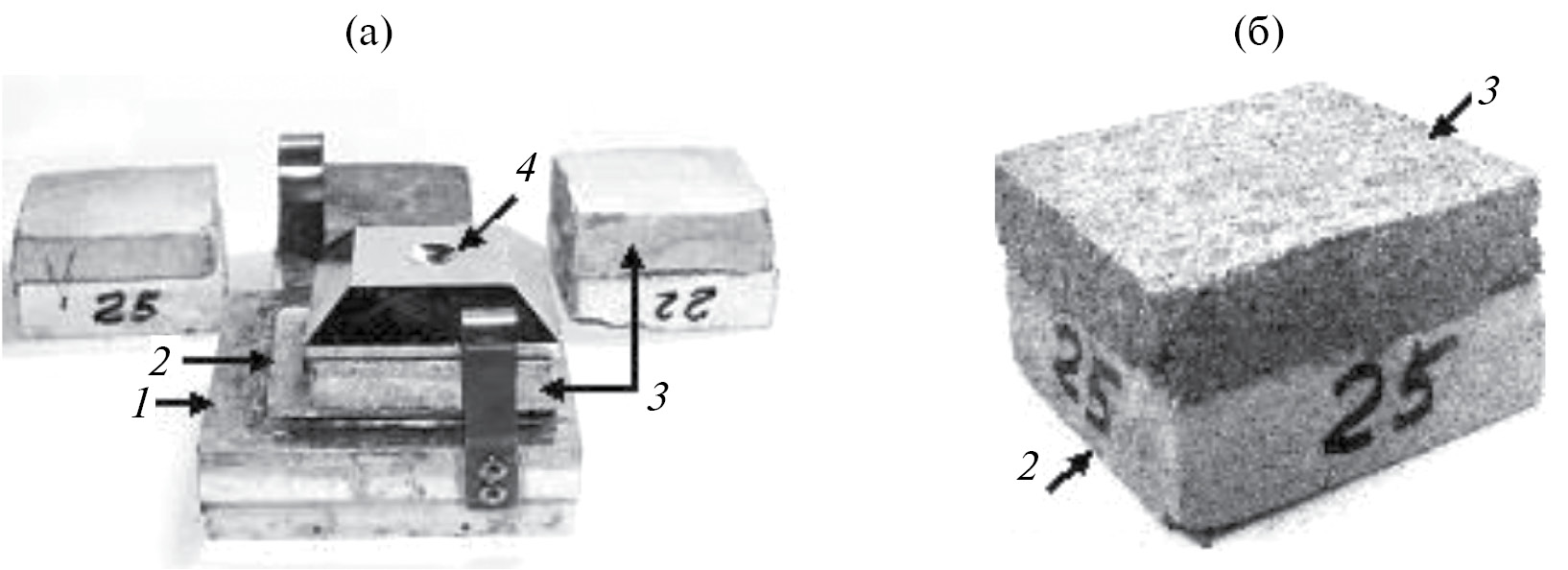 Укрупненно основной испытательный узел сдвигового прибора показан на рис. 1а. В нижнюю, жестко закрепленную часть каретки прибора (1), помещался образец исследуемой породы (2). Вертикальная нагрузка в диапазоне давлений σ = 0.025–0.46 передавалась через верхний штамп (4) прибора. В верхней подвижной части каретки (на рис. 1а ее кожух не показан) располагалась модель сваи (3), выполненная в виде цементной плашки квадратного сечения площадью 36 см2 (рис. 1б).