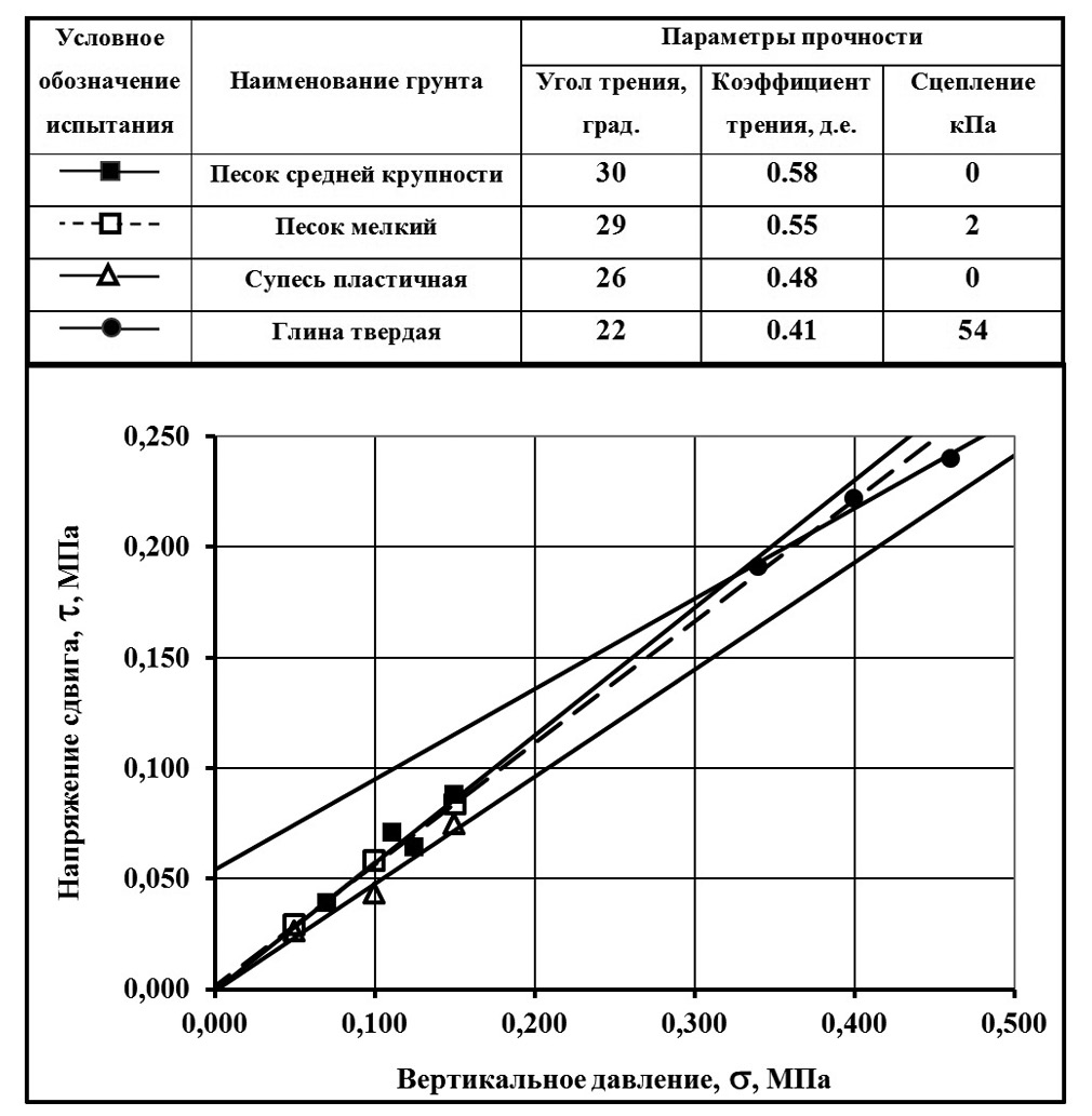 Рис. 3. Параметры прочности на сдвиг шероховатых плашек из цементного материала по образцам дисперсных грунтов.