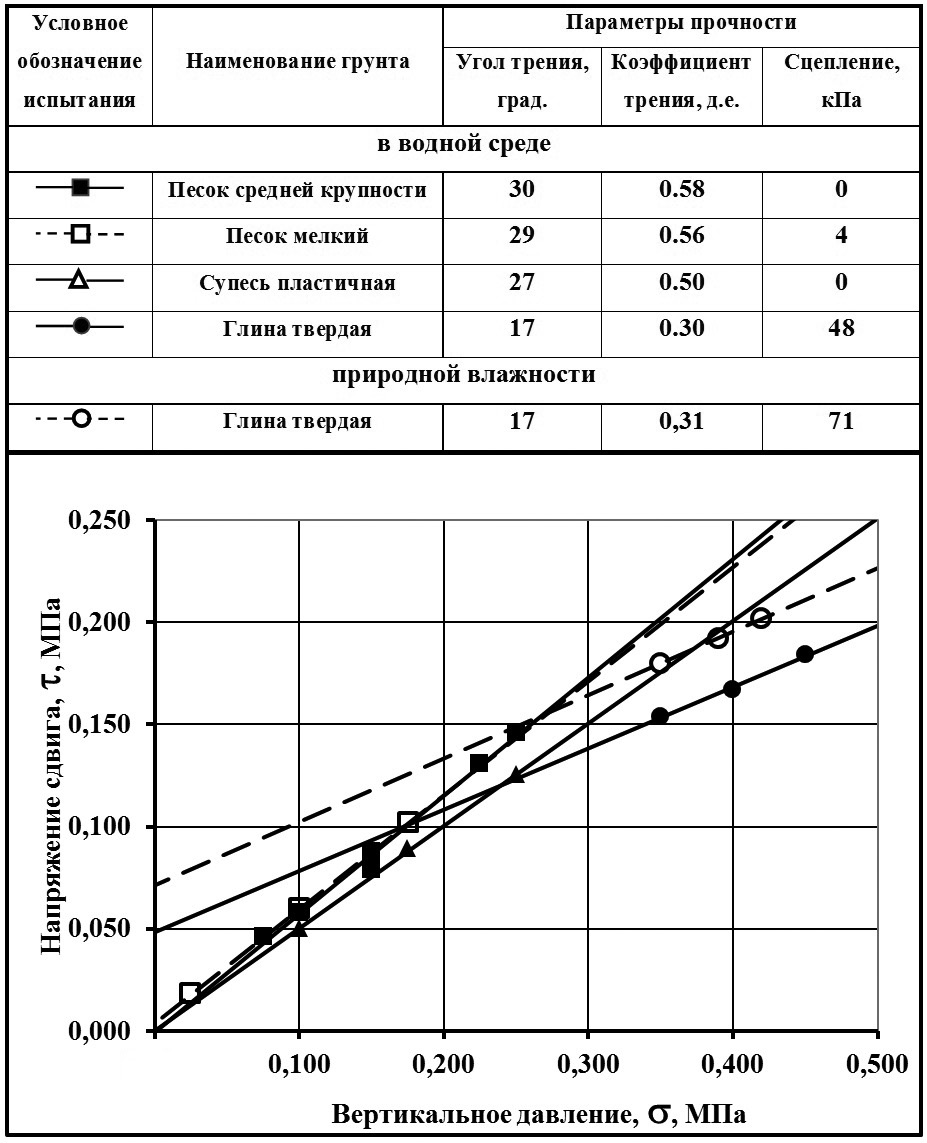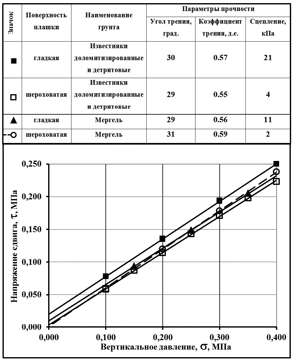 Рис. 2. Параметры прочности на сдвиг гладких плашек из цементного материала по образцам дисперсных грунтов.