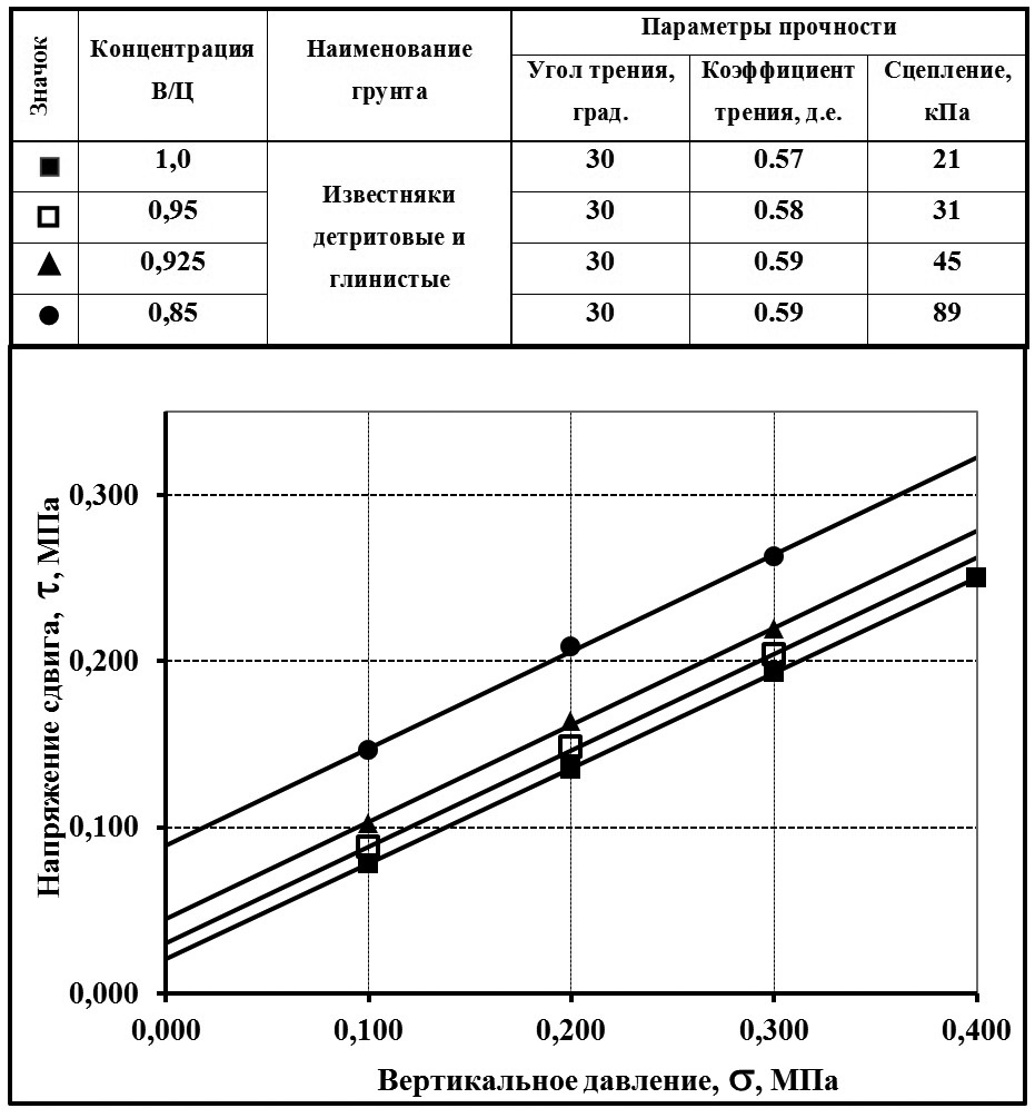 Прогнозируемое достижение композитной моделью прочности известняка возможно уже при водоцементном отношении В/Ц ≈ 0.5. Таким образом, сдвиговая прочность по боковой поверхности модели сваи в принятых условиях (σ = 0.1 МПа) может составить ~ 1.55 МПа при установленном в опытах и упомянутом выше коэффициенте трения k ≈ 0.60 (при φs = 30°).