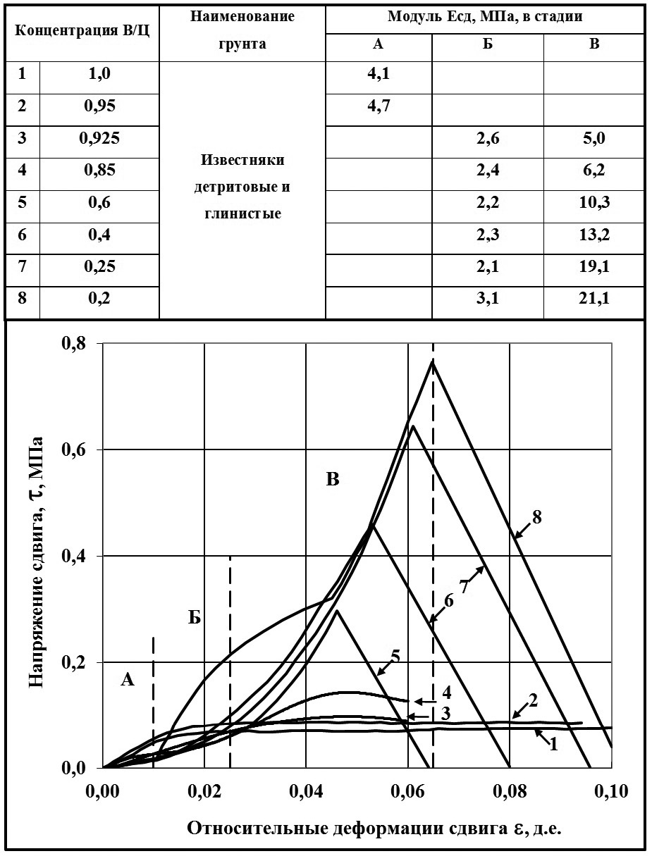 Для наиболее низких концентраций вяжущего (В/Ц = 1.00–0.96) на этапе А происходит мобилизация сил сопротивления сдвигу, накопление деформаций вплоть до предельных, после чего наступает разрушение. Характерный модуль деформаций сдвига составляет 4.1–4.7 МПа.