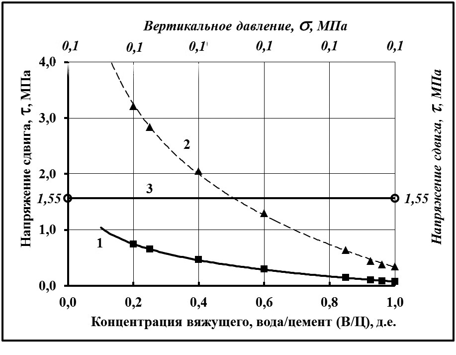При наибольшей концентрации вяжущего (В/Ц = 0.2) напряжение сдвига в опытах составляло 0.74 МПа (кривая 1), но не превышало значений сдвиговой прочности грунтового материала τ =1.55 МПа (для известняков детритовых и глинистых при той же нагрузке σ = 0.1 МПа) (линия 3). Необходимо упомянуть, что, обычно, при анализе оперируют расчетной прочностью, которая достигается после оптимального времени твердения композитной модели. Прогноз расчетной прочности, выполненный на основе таблицы 2 СП 82-101-98 “Приготовление и применение растворов строительных”, показан на рис. 7 кривой 2.