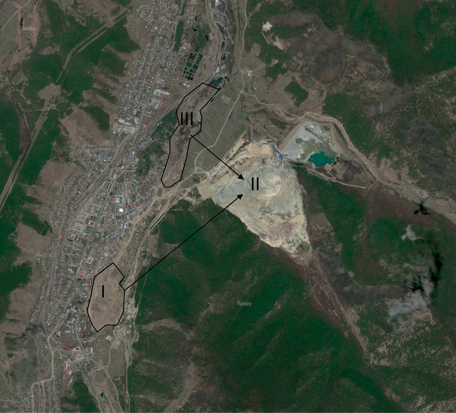 В 2010–2012 гг. лежалые пески с насыпного (см. рис. 1, I) и аварийного (см. рис. 1, II) хвостохранилища были перевезены на территорию намывного (см. рис. 1, III) хвостохранилища поближе к действующему по настоящее время комбинату для их вторичной переработки. Перевозка осуществлялась вблизи русла р. Модонкуль. Помимо смыва материала хвостохранилища в р. Модонкуль, впадающей в р. Селенга (приток оз. Байкал), произошла дополнительная нагрузка на экологическое состояние окружающей среды и здоровье населения г. Закаменск [3, 10, 12, 26, 27]. При транспортировке техногенных песков грузовыми машинами с открытым кузовом произошло активное рассеивание загрязняющих веществ в виде пыли в атмосфере за пределами санитарной зоны городской территории. Еще не слежавшийся перевезенный песок подвергался естественному ветровому разносу. В связи с этим были проведены различные исследовательские работы по оценке воздействия отходов обогащения руд на компоненты окружающей природной среды: почвы, водные и растительные объекты [6, 8, 25]. В результате анализа природных объектов обнаружено, что произошло увеличение концентрации элементов-токсикантов в объектах наземной среды за счет атмосферного рассеивания мелкодисперсных частиц отходов руд. После рекультивации земель произошло неполное зарастание растительностью площадей, занятых техногенными песками.