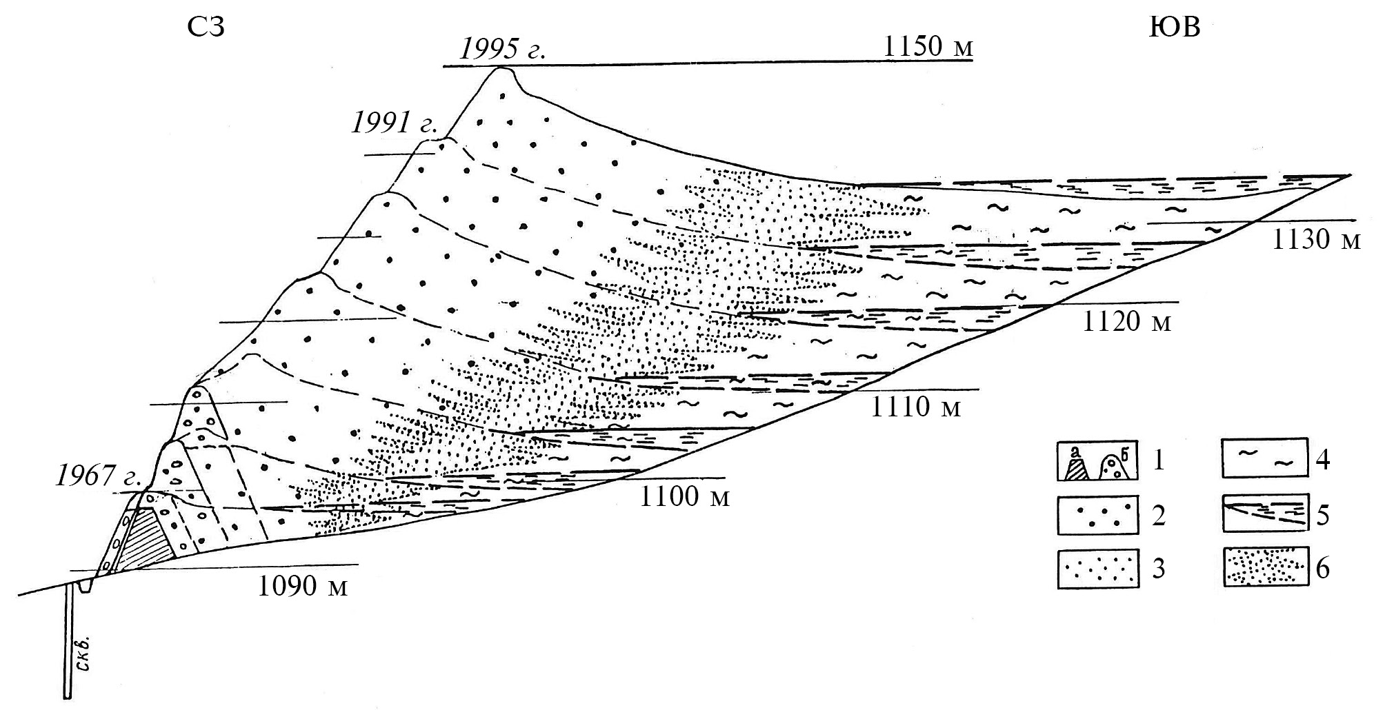 Рис. 2. Схема формирования намывного хвостохранилища. 1 – дамба (а) и ее ядро (б); 2–4 – разновидности материала хвостохранилища: 2 – крупно-, среднезернистые пески, 3 – мелко-, тонкозернистые пески, алевритистые осадки (пылеватые пески), 4 – тонкозернистые пески, илистые осадки (илы); 5 – водоносный горизонт; 6 – граница литологических разностей.