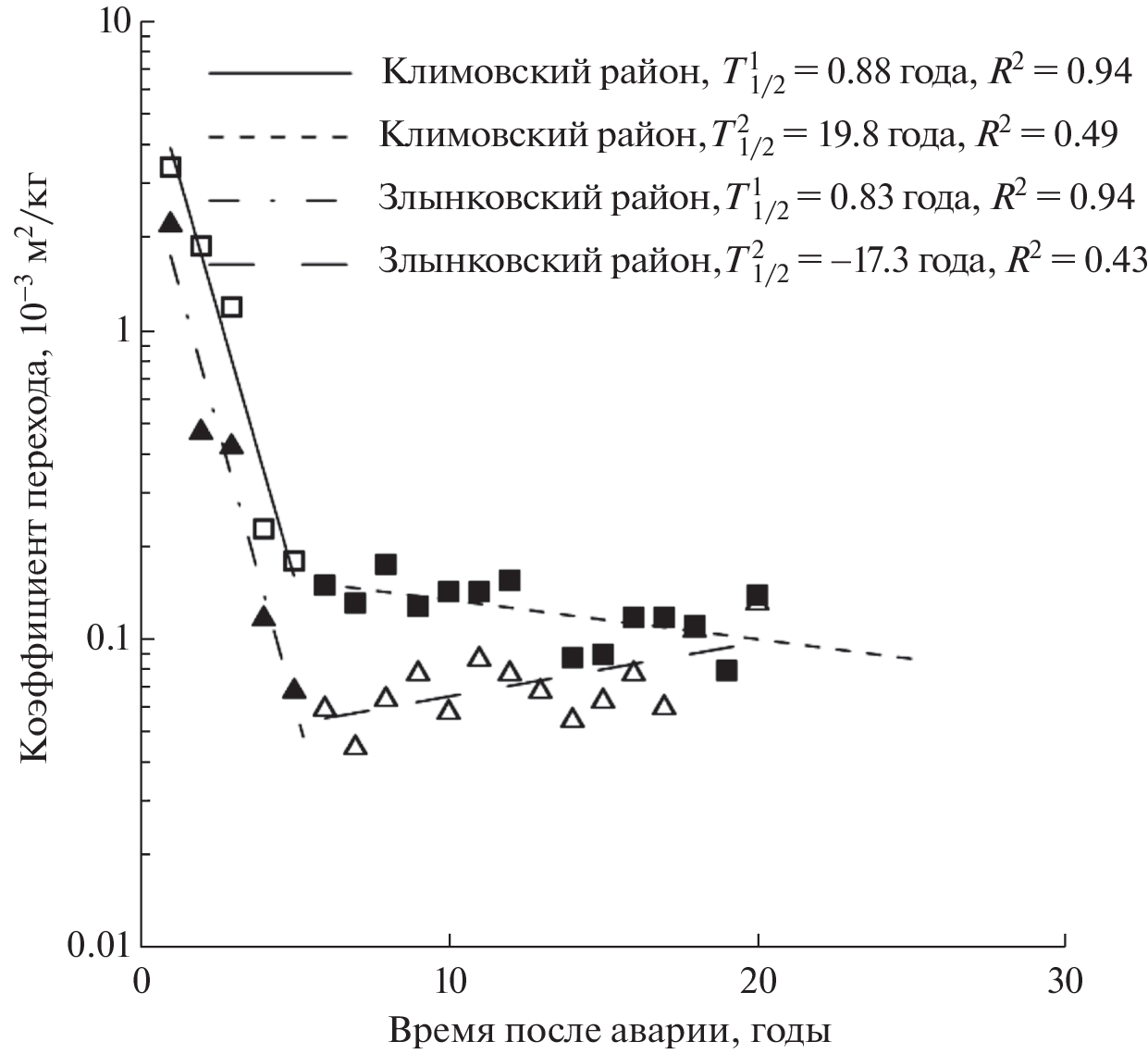 The results of the analysis of the 137Cs aggregated transfer factors (Tag) to crops (cereals, potatoes, and vegetables) produced in the districts of the Bryansk region affected after the Chernobyl accident are presented. The aggregated transfer factors in the year of the deposition as well as the dynamics of Tag in the subsequent years depended considerably on the fertility of soils subjected to contamination. The transfer factors of 137Cs to crops in the areas with higher fertility were 3–8 times lower (depending on the plant species) than in the areas with low fertility, and the most significant differences were observed for cereals. Decrease in Tag values was of irregular nature. The half-lives of 137Cs aggregated transfer factors for the period from 1986 to 2021 were calculated. It is shown that the first half-life values calculated for the period of intensive application of countermeasures (1987–1991) were from 0.7 to 1.4 years. The second half-lives varied from 7.3 to 17.3 years. In some areas, after a strong reduction in 137Cs concentrations in crops after 1994, there was a slow increase in 137Cs aggregated transfer factors, which can be explained by insufficient compensation for this decrease of geochemical binding of 137Cs in the soil. Later the dynamics of crop contamination was determined by multidirectional processes: i.e., increase in 137Cs transfer to plants and natural decrease of radionuclides bioavai-lability in soils under the influence of geochemical processes. In areas with intensive application of countermeasures, the reduction of Tag to crops was determined to a greater extent by the influence of agrochemical countermeasures. In the areas with limited application of countermeasures, the natural biogeochemical processes determining radionuclide binding by the soil-absorbing complex made the predominant contribution to the Tag reduction. Limitations of the approach based on the estimation of half-lives and the necessity of using the history of countermeasures implemented, as well as the soil fertility for prediction of the 137Cs intake by plants is noted.