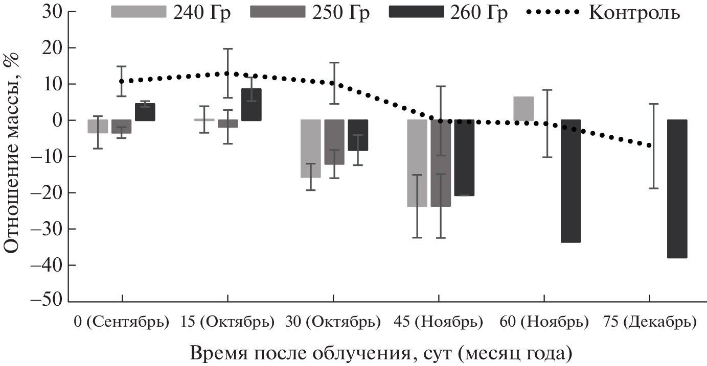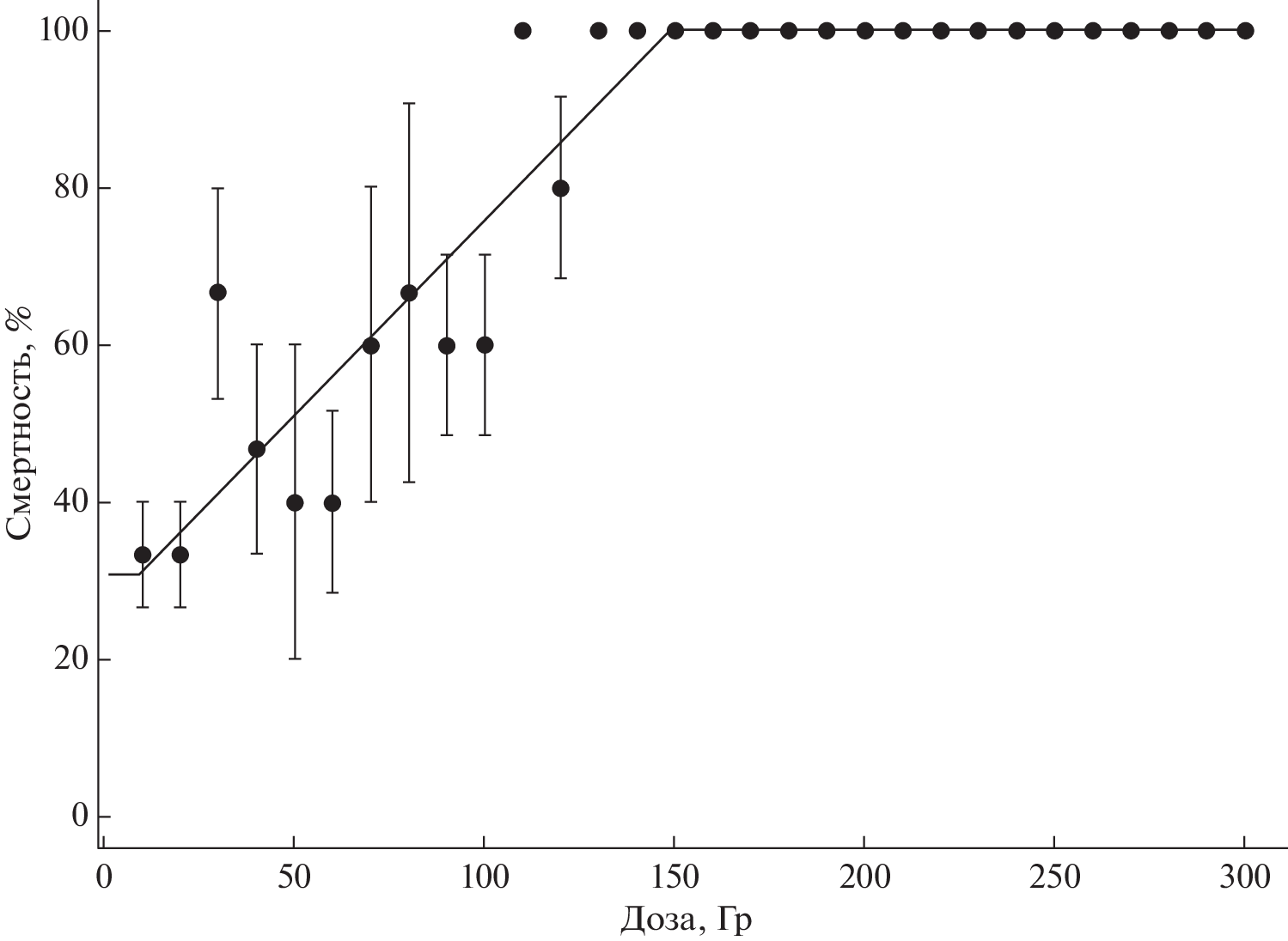 The results of the study of relevant indicators of mortality and biomass after ɣ-irradiation in the dose of 10–300 Gy of the terrestrial mollusk F. fruticum M. are presented. Mollusks of the second age group were selected. The age of the mollusks was determined by the number of revolutions of the shell. The conditions of keeping the mollusk in the laboratory were experimentally selected in such a way that the survival rate in the control group was 100%. The duration of the experiment (210 days) and the range of radiation doses (10–300 Gy) made it possible to establish the LD50/60 index for a terrestrial mollusk of the second age group. It is 115.6 ± ± 33.8 Gy. LD50/60 was determined by the calculated method of probit analysis using the least squares method. Three dose ranges (10–100, 110–170 and 180–300 Gy of changes in the studied relevant indicators were established. For each time range, starting from 60 days after irradiation, a linear threshold dependence with three dose ranges was established: a dose-independent plateau at low radiation doses, a dose-dependent range with an increase in the radiation dose, and a dose-independent plateau when absolute mortality occurs.