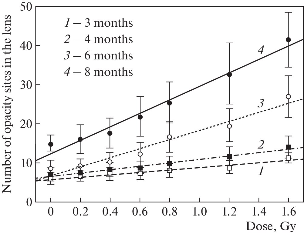 - Dalke C., Ne F., Bains S.K., Bright S. et al. Lifetime study in mice after acute low-dose ionizing radiation: a multifactorial study with special focus on cataract risk // Radiat. Environ. Biophys. 2018. V. 57. № 2. P. 99–113. https://doi.org/10.1007/s00411-017-0728-z