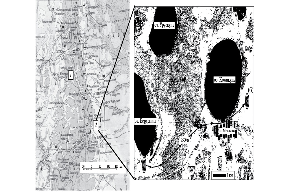 Рис. 1. Карта-схема расположения участков исследований: 1 – Шигаево (Свердловская обл.) – референтная территория; 2 – зона влияния ВУРС (Челябинская обл.). На врезке участки мечения и отлова мелких млекопитающих, дистанция 9300‒9500 м (а – зона ВУРС, б – контроль).