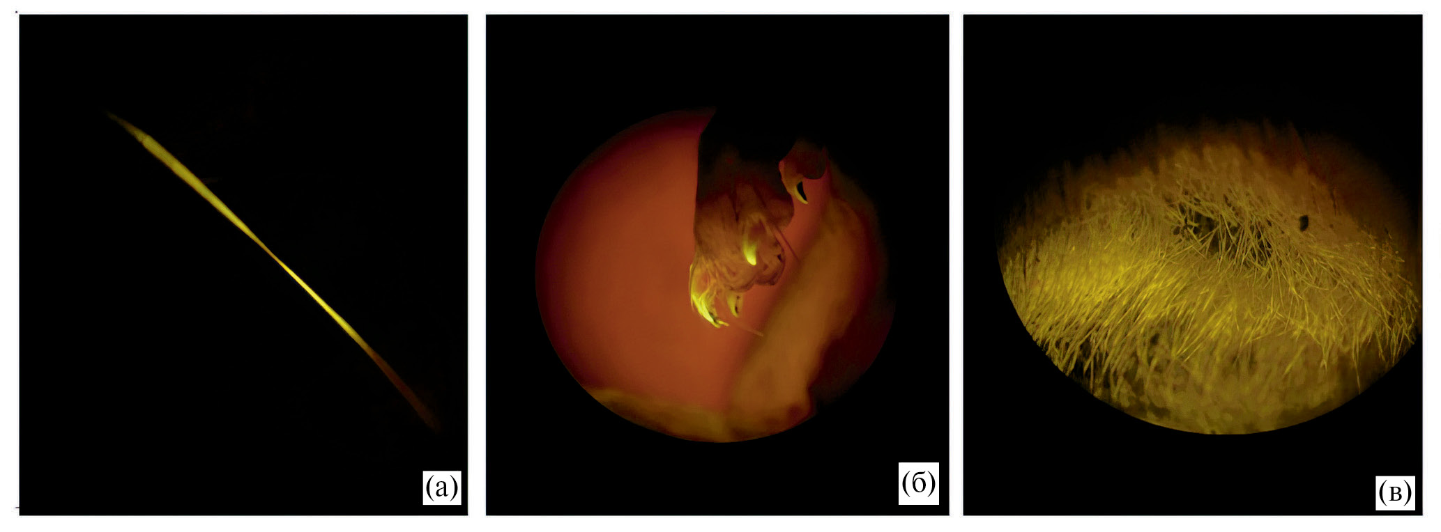 Рис. 2. Родаминовые метки (желтая флуоресценция) у дальних мигрантов красных полевок (M. rutilus Pallas, 1779) при поедании приманки с красителем: а – двойная метка в вибриссе и б – метка в когтях самки-сеголетки через 78 дней после раскладывания приманки с родамином В; в – метка на шее зимовавшего самца спустя 251 день после мечения.