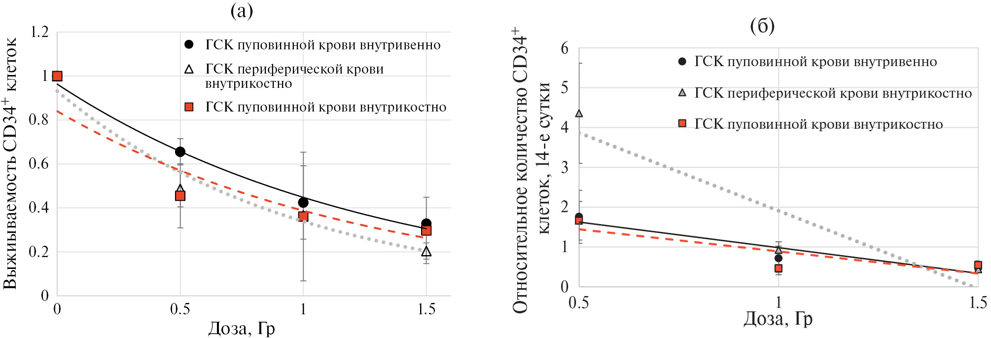 Важно отметить, что модели, описывающие зависимость выживаемости клеток от дозы, полученные для ГСК пуповинной крови с внутривенным введением и периферической крови, не отличались: нет статистически значимых отличий при сравнении коэффициентов (t = 1.18; p = 0.24) и свободного члена (t = 0.15; p = 0.88) в уравнениях зависимости выживаемости ГСК от дозы на 3-и сутки после облучения. Также нет статистически значимых отличий выживаемости ГСК пуповинной крови при внутрикостном введении от выживаемости ГСК пуповинной крови при внутривенном введении при сравнении в уравнениях зависимости коэффициентов (t = 0.78; p = 0.24) и свободного члена (t = 0.22; p = 0.82). Нет отличий при сравнении моделей с внутрикостным введением ГСК пуповинной и периферической крови при сравнении коэффициентов (t = 0.22; p = 0.83) и свободного члена (t = 0.32; p = 0.75) в уравнениях зависимости выживаемости ГСК от дозы на 3-и сутки после облучения.