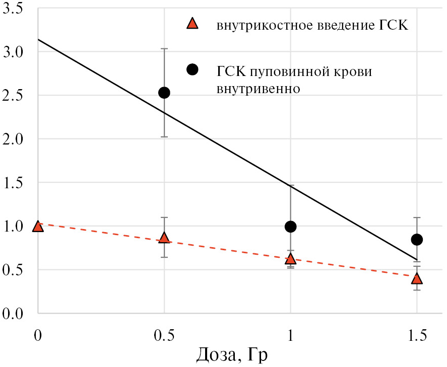 На 14-е сутки после облучения количество клеток по отношению к необлученному контролю описывалось линейной функцией, имело обратную зависимость от дозы (для модели ГСК пуповинной крови модель статистически не значима; для ГСК периферической крови R2 = 0.65; F = 12.90; p = 0.009; для ГСК пуповинной крови при внутрикостном введении R2 = 0.44; F = 5.5; p = 0.05) (рис. 1, Б). Следует отметить, что после облучения в дозе 0.5 Гр количество ГСК могло как превышать их контрольный уровень у необлученных животных (относительное количество ГСК больше 1), так и оставаться сниженным у отдельных доноров.