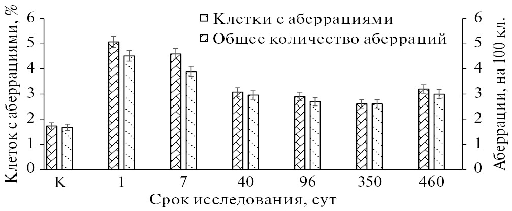 Проведенный цитогенетический анализ лимфоцитов периферической крови обезьян, подвергшихся воздействию ускоренных ионов 78Kr в дозе около 3 Гр, позволил выяснить, что средний уровень аберрантных клеток у локально облученных обезьян через сутки после облучения вырос почти в 2.7 раза по сравнению с контролем (рис. 1). Спустя 7 сут после облучения головы обезьян ионами криптона количество клеток и общее число хромосомных нарушений снизилось на 10–15٪ и составило 3.9 и 4.6 соответственно, превышая контрольный уровень в 2.3 и 2.6 раза.