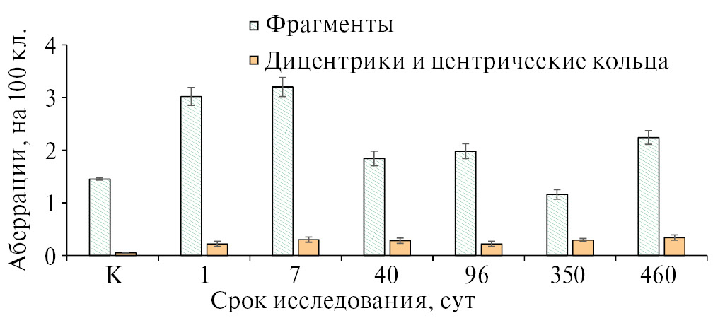 Результаты анализа дицентриков и центрических колец показали, что через 1 сут после локального облучения ионами криптона средний уровень дицентриков и центрических колец вырос в более чем 11 раз по сравнению с контролем и оставался повышенным на протяжении всех сроков исследования. К 460-м суткам исследования маркеры радиационного воздействия все еще превышали показатели контрольного уровня. Уровень хроматидных и хромосомных фрагментов к этому сроку также снизился. Вместе с тем на 460-е сутки отмечено увеличение числа хромосомных фрагментов по сравнению с предыдущим сроком наблюдений с 0.30 до 0.75 на 100 клеток.