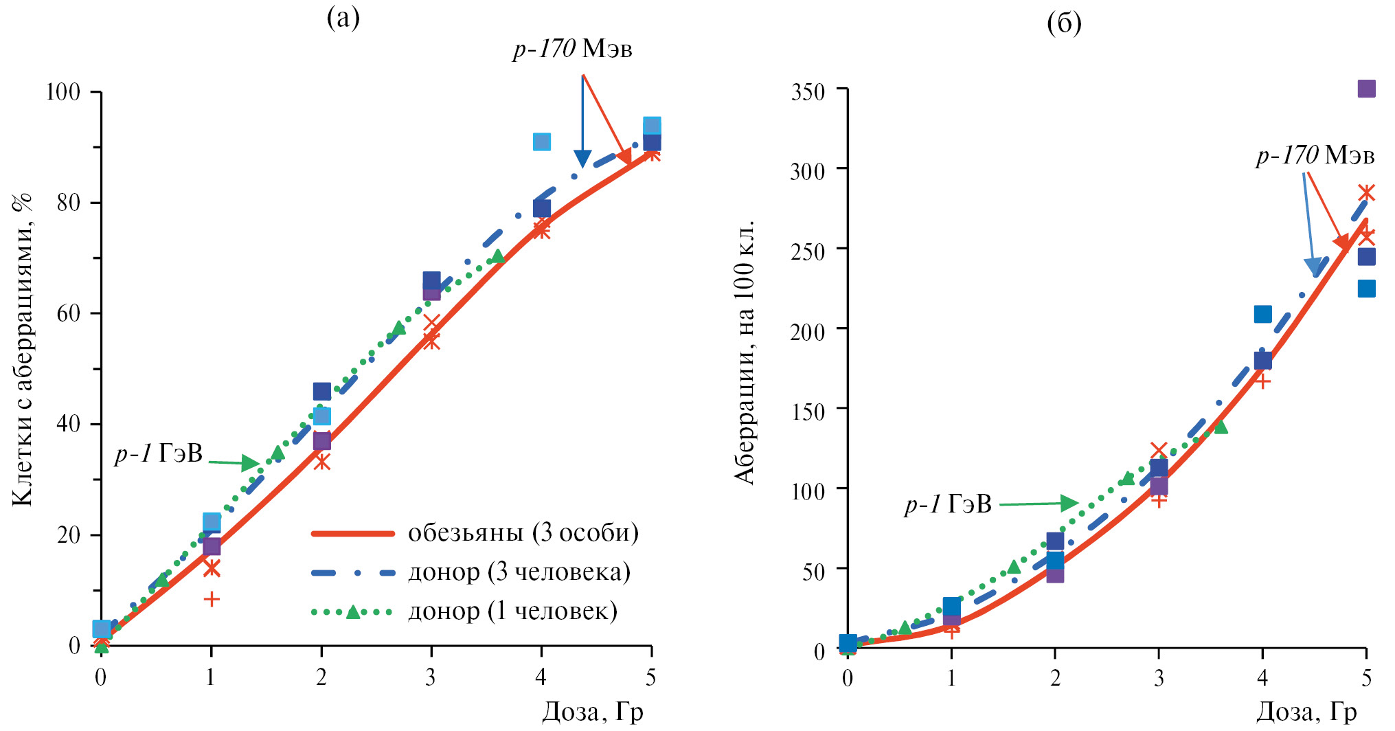 Ранее в нашей лаборатории получены результаты цитогенетического исследования клеток человека после облучения протонами разных энергий [16–18]. Данные после воздействия протонов с энергией 170 МэВ и 1 ГэВ на лимфоциты человека и обезьян при облучении крови in vitro представлены на рис. 2. Характер дозовой зависимости по выходу клеток с хромосомными аберрациями после воздействия протонов на лимфоциты обезьян имеет линейный вид вплоть до 4 Гр с последующим отклонением от линейности и выходом на уровень насыщения. Для общего числа хромосомных аберраций наблюдается степенная линейно-квадратичная зависимость от дозы вследствие вклада аберраций двухударного типа.