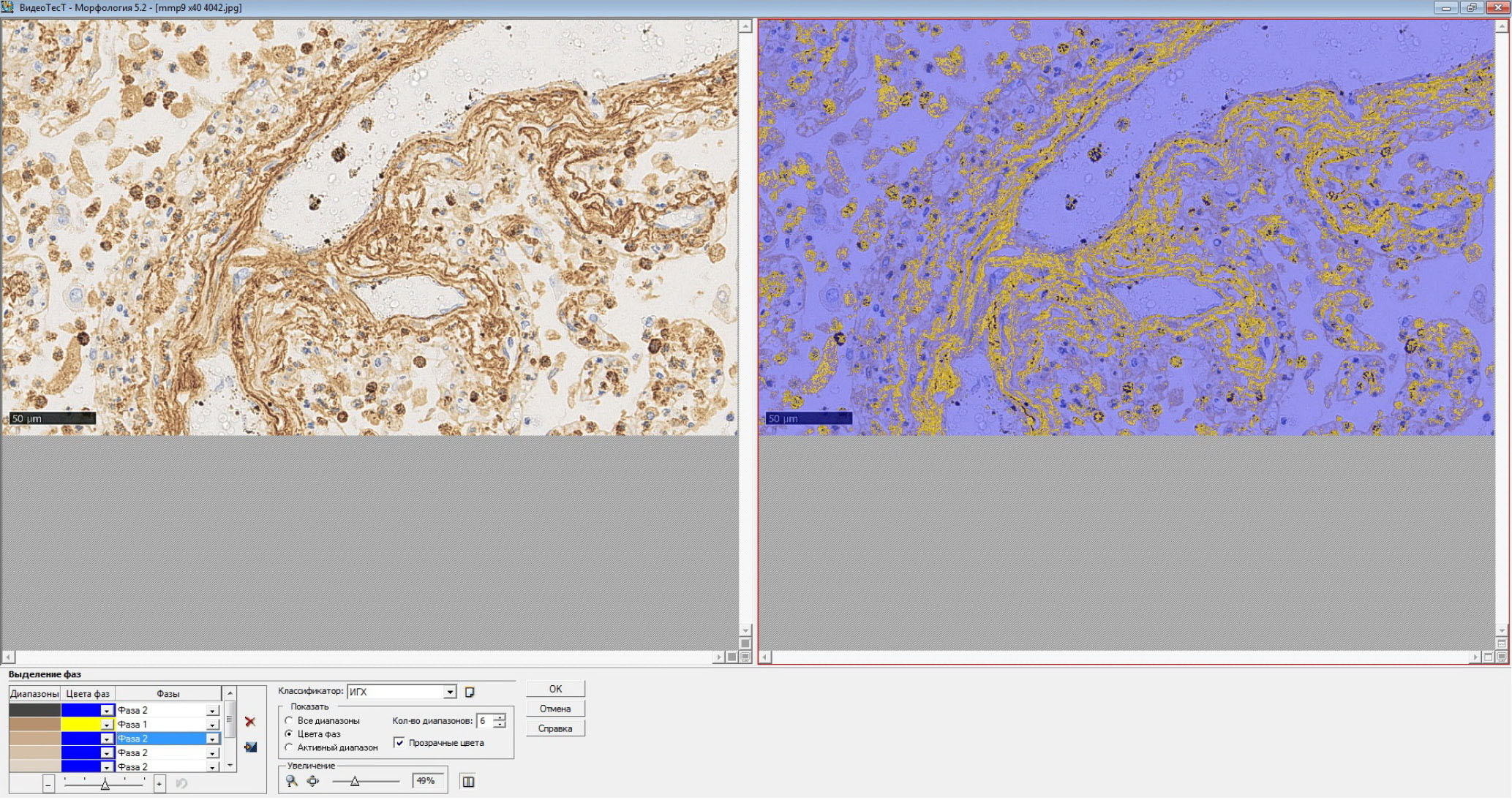 Рис. 1. Использование псевдоцветных масок над изображениями, подчеркивающими экспрессию MMP-9 в эндотелии сосудов и волокнистых элементах легочной стромы, для количественного определения содержания металлопротеиназы в срезе легочной ткани.