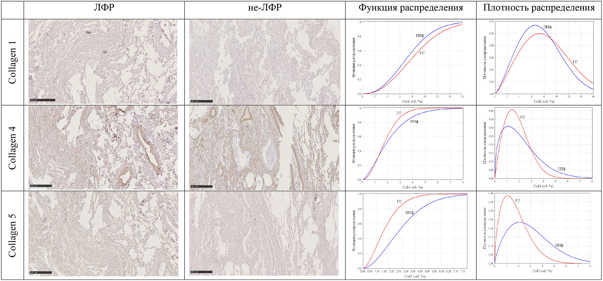 Fig. 2. Expression of collagens type I, IV and V in LF and non-LF specimens. Immunohistochemistry with antibodies against Collagen type I, Collagen type IV, Collagen type V, polymer test-system. Magnification ×50. Scale 500 μm. LF and ППФ denotes plutonium-induced lung fibrosis, non-LF denote lung fibrosis of a different origin, ГС denotes control (no pulmonary pathology).