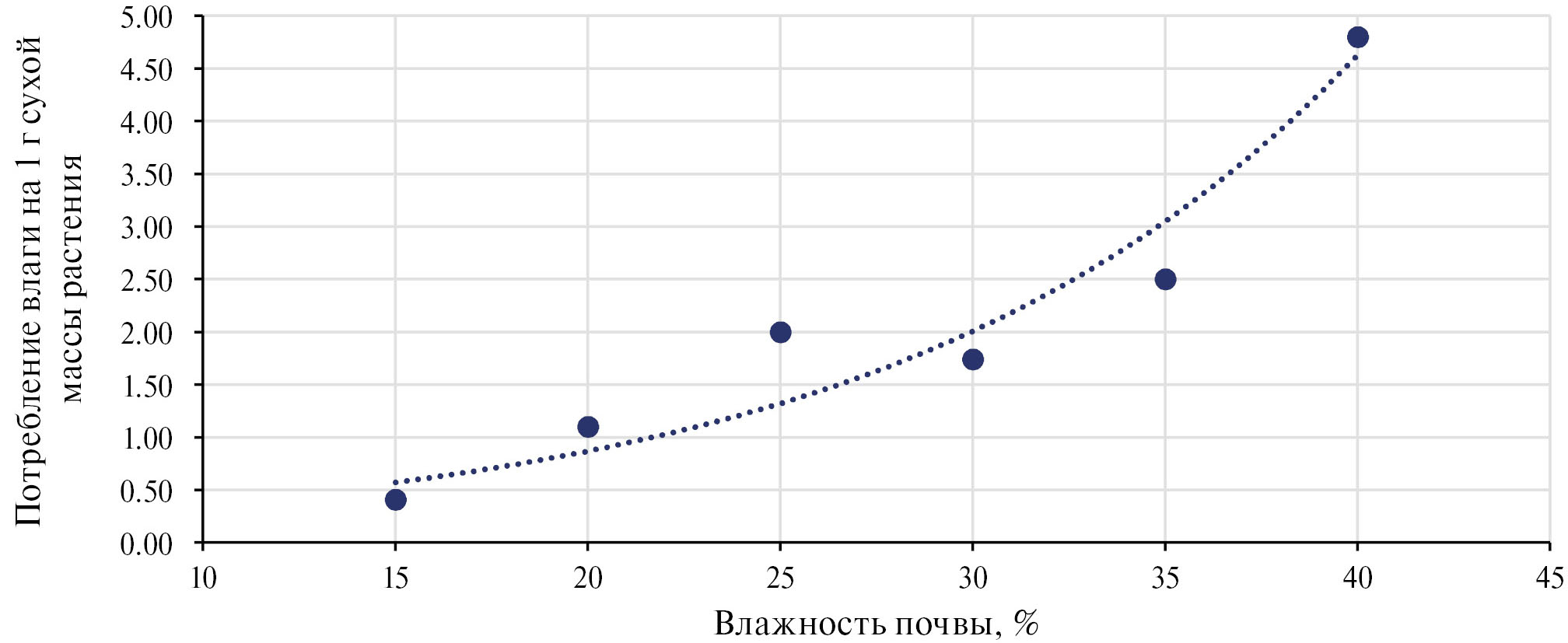 Для установления потребления влаги растениями для каждой точки дублировался сосуд с “черным паром”(рис. 1). Расчет потребляемой влаги растениями рассчитывали, как разницу между потерей массы в сосудах с растениями и “черным паром” одинаковой влажности. Поскольку масса растений в сосудах отличалась, проведен перерасчет потребления влаги к единице сухой массы растения. Результаты расчета потребления растениями влаги представлено на рис. 2.