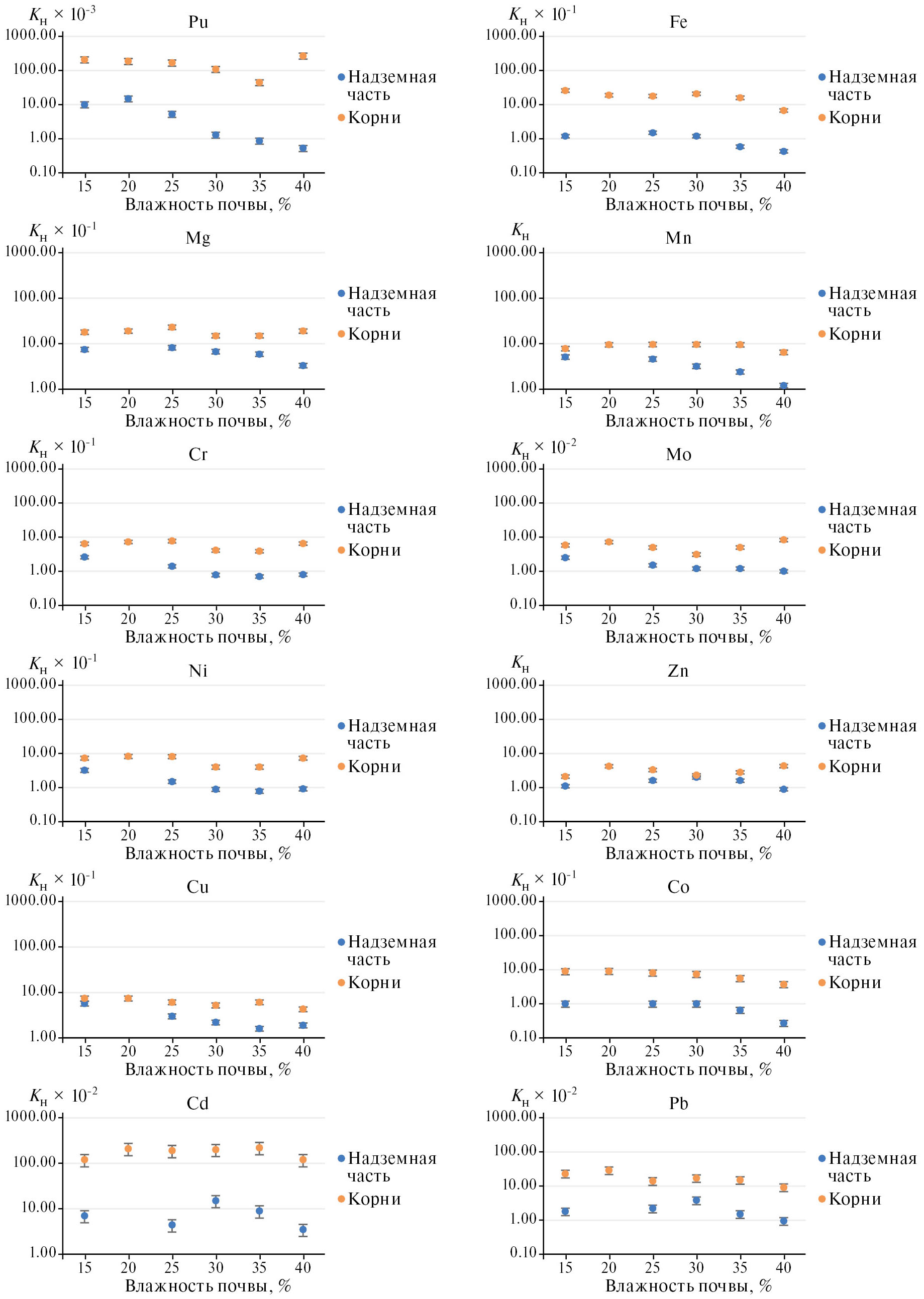 Зависимость коэффициентов накопления, полученных в ходе вегетационных опытов, от влажности почв представлена на рис. 4. Для сопоставления надземной и корневой частей бобов данные представлены в логарифмической шкале по оси ординат.