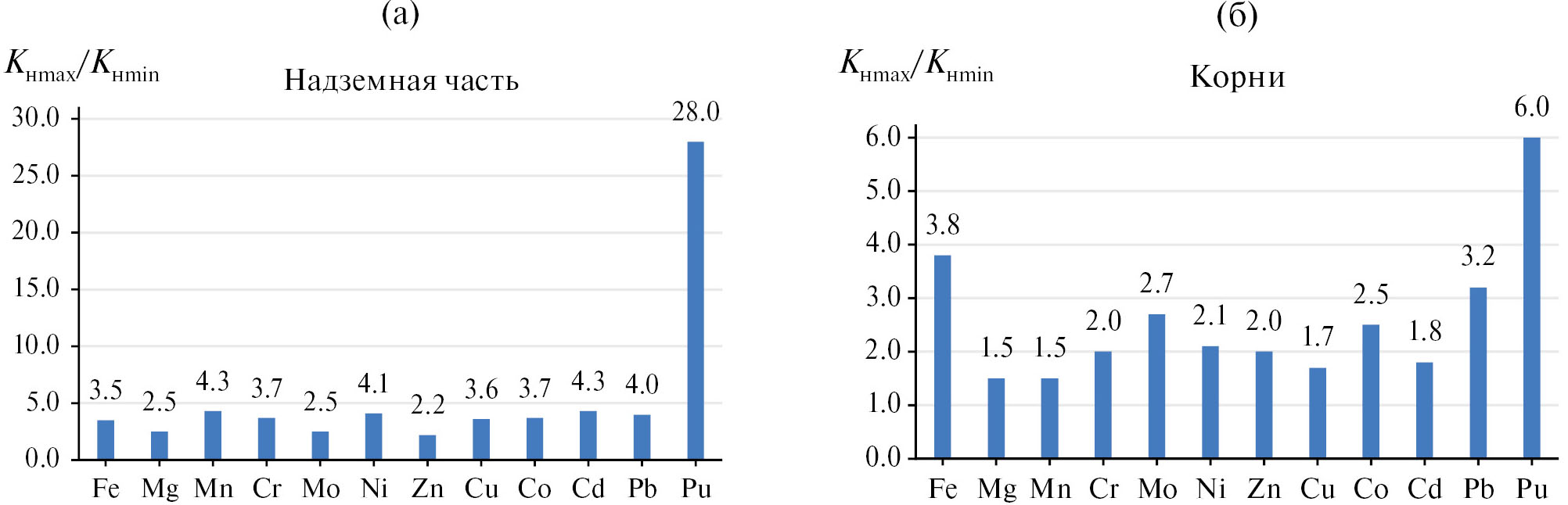 Полученный диапазон значений Кн для свинца, равный 0.0094–0.038 при среднем значении 0.02 входит в представленный диапазон значений Кн(Pb) в публикациях МАГАТЭ в 0.00046–4.9 [2–4], и ниже полученных во ВНИИРАЭ данных, составляющих диапазон от 0,4 до 24,9 при среднем значении 13 [5]. Возможно это связано с тем, что Кн(Pb) полученные в настоящем исследовании рассчитывались для бобов, выращенных на фоновых концентрациях ТМ в почвах. В то время как в обобщенных данных ВНИИРАЭ Кн свинца представлены для бобовых, выращенных на почвах с разной концентрацией свинца в почве, в том числе и с высокой.