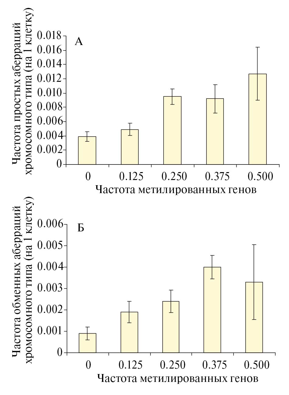 Рис. 1. Частоты аберраций хромосом у облученных лиц в зависимости от статуса метилирования промоторов генов: А – простые аберрации хромосомного типа; Б — обменные аберрации хромосомного типа.