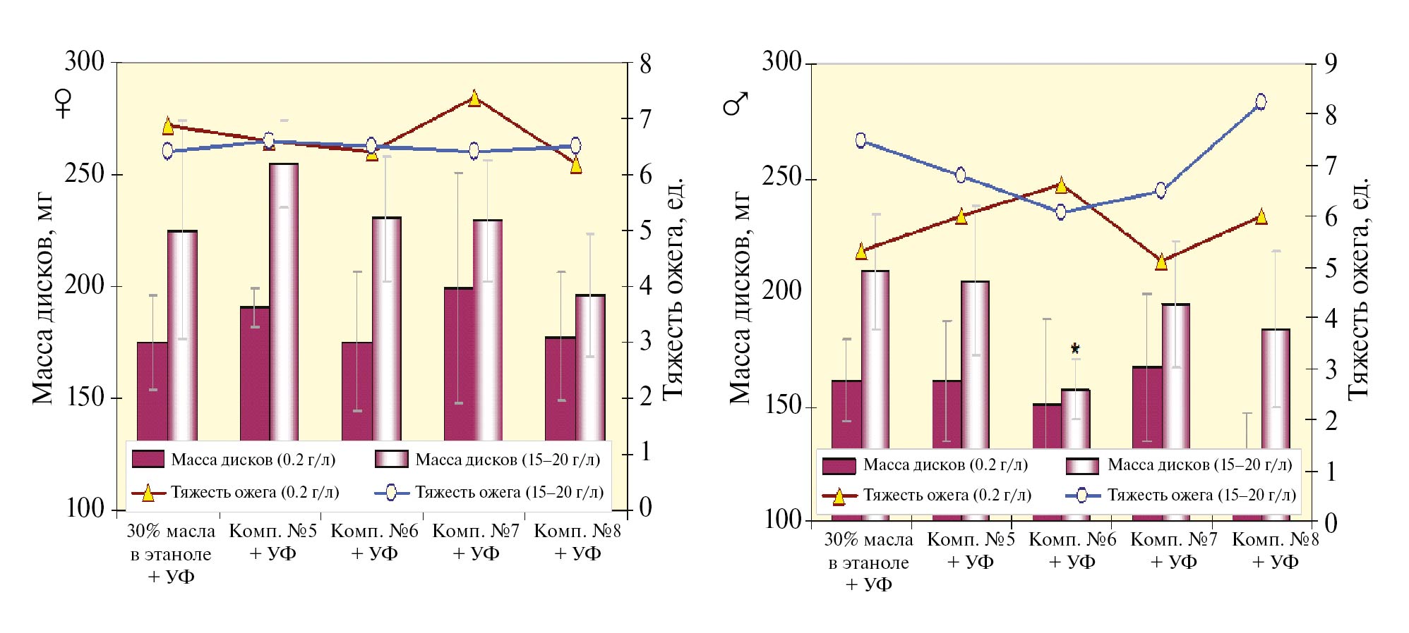 В эксперименте при концентрации 15–20 г/л у самок статистически значимых различий по толщине кожной складки и по массе дисков между группами не отмечено. У самцов в большинстве случаев также не было значимых различий с группой “30%-ного касторового масла в этаноле +УФ”, за исключением композиции № 6, где масса дисков была статистически значимо снижена и имела, как и тяжесть ожога, наименьшую величина в данном эксперименте (6 баллов). Для композиций № 5 и № 7 данные параметры имели практически схожие значения.