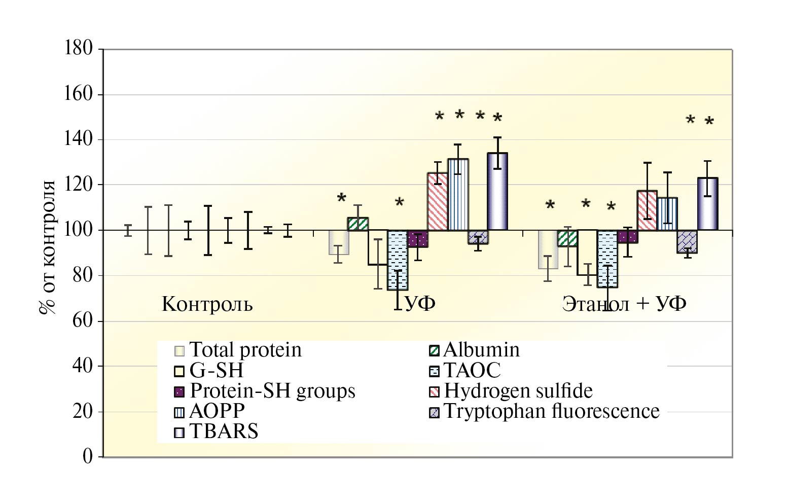 Одновременно с общим белком в обеих группах снизились величины некоторых антиоксидантных параметров: концентрация GSH 15–20% и ТАОС на ~25%. По обоим параметрам статистически значимые различия с контролем были в группе “Этанол + УФ”. Уровень протеиновых SH-групп понизился незначительно. Снижение значений данных параметров после УФ-облучения очевидно и очередной раз указывает на развитие окислительного стресса. Аппликации этанола заметно не модифицировало данные эффекты. В противовес этим параметрам в обеих группах логично и заметно выросли уровни прооксидантных параметров: конечных продуктов окисления белков АОРР (на 14 и 31%), сероводорода (на 17 и 25%) и TBARS (на 22 и 34%). При этом данные параметры были снижены в группе “Этанол + УФ” в большей мере, хотя и статистически незначимо. В этой же группе отмечено и небольшое, но значимое снижение триптофановой флуоресценции.