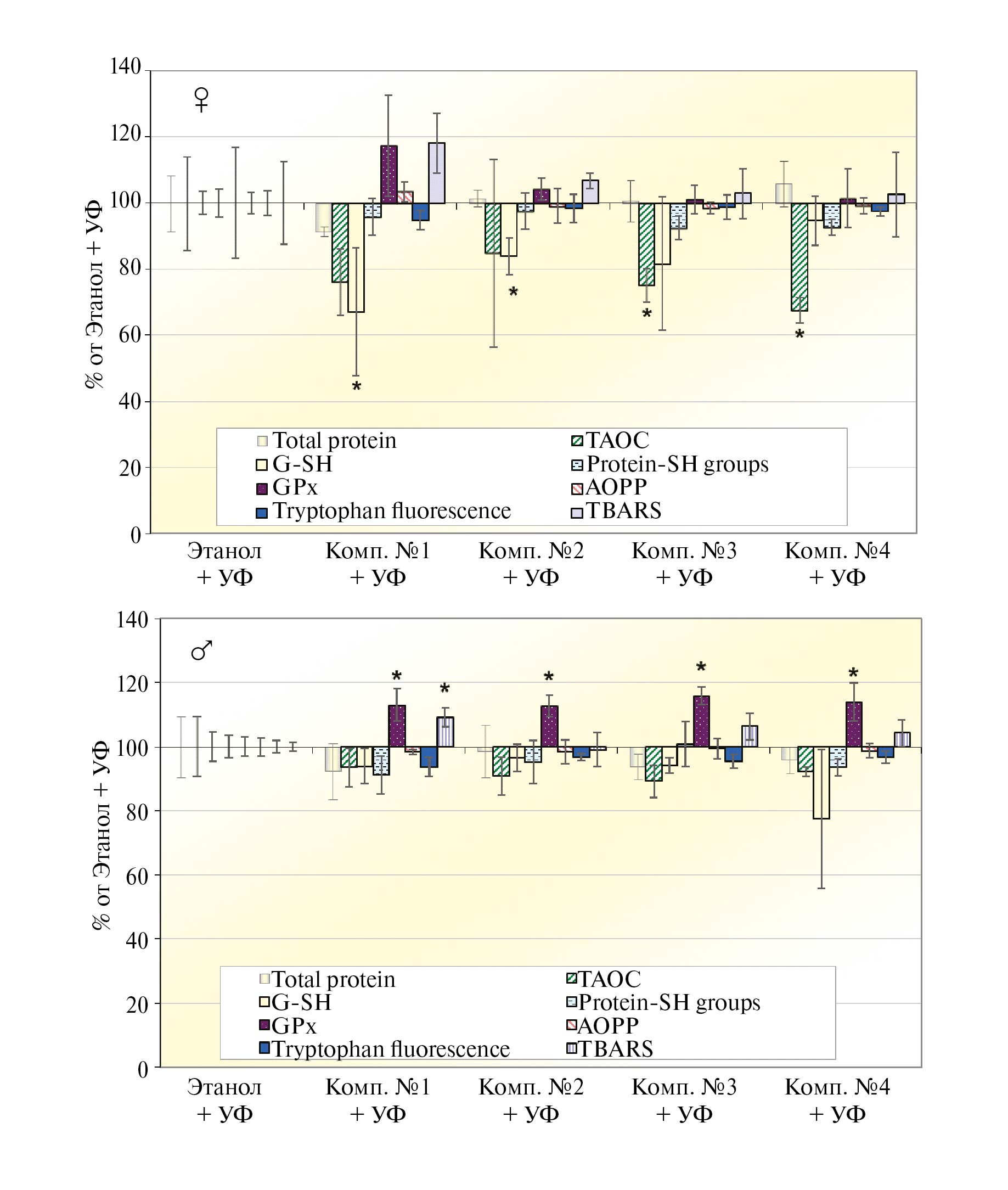 Этанольные композиции. Половые различия, отмеченные для указанных морфометрических показателей, наблюдались и при анализе биохимических параметров сыворотки крови. Опыт на самках показал падение уровня ТАОС во всех группах относительно группы “Этанол +УФ” (рис. 4) на 15–32%. Наиболее выраженно и статистически значимо это происходило в случае использования композиций № 3 и № 4. У самцов в этом плане тенденция была схожая, но различия с группой “Этанол + УФ” были несущественными и незначимыми. То же относится и к общему белку и уровню протеиновых SH-групп, уровень которых так же существенно не изменялся ни у самцов, ни у самок. Для всех композиций у обоих полов изменения почти не коснулись ни триптофановой флуоресценции, ни АОРР.
