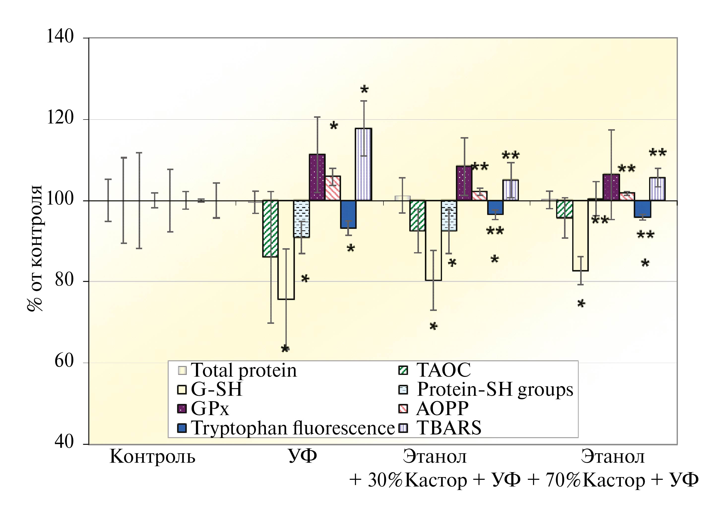 Концентрация GSH статистически значимо относительно контроля снизилась при всех вариантах облучения: на 25, 20 и 18%. В значительно меньшей степени, статистически незначимо, но с той же тенденцией это происходило и для ТАОС — на ~14, 8 и 5%. По обоим параметрам между группами “Касторовое масло в этаноле +УФ” не было статистически значимых различий с группой “УФ”. А вот небольшое, но значимое снижение триптофановой флуоресценции в тех же группах таковые имело (в том числе относительно контроля): в группе “УФ” — 7%, в группах “Касторовое масло в этаноле +УФ” — 3–4%. В несколько иных пропорциях схожая картина отмечена и для протеиновых SH-групп, уровень которых в группах “УФ” и “30% кастор. масла в этаноле +УФ” статистически значимо понизился относительно контроля, а при 70% касторового масла полностью сошел на нет.