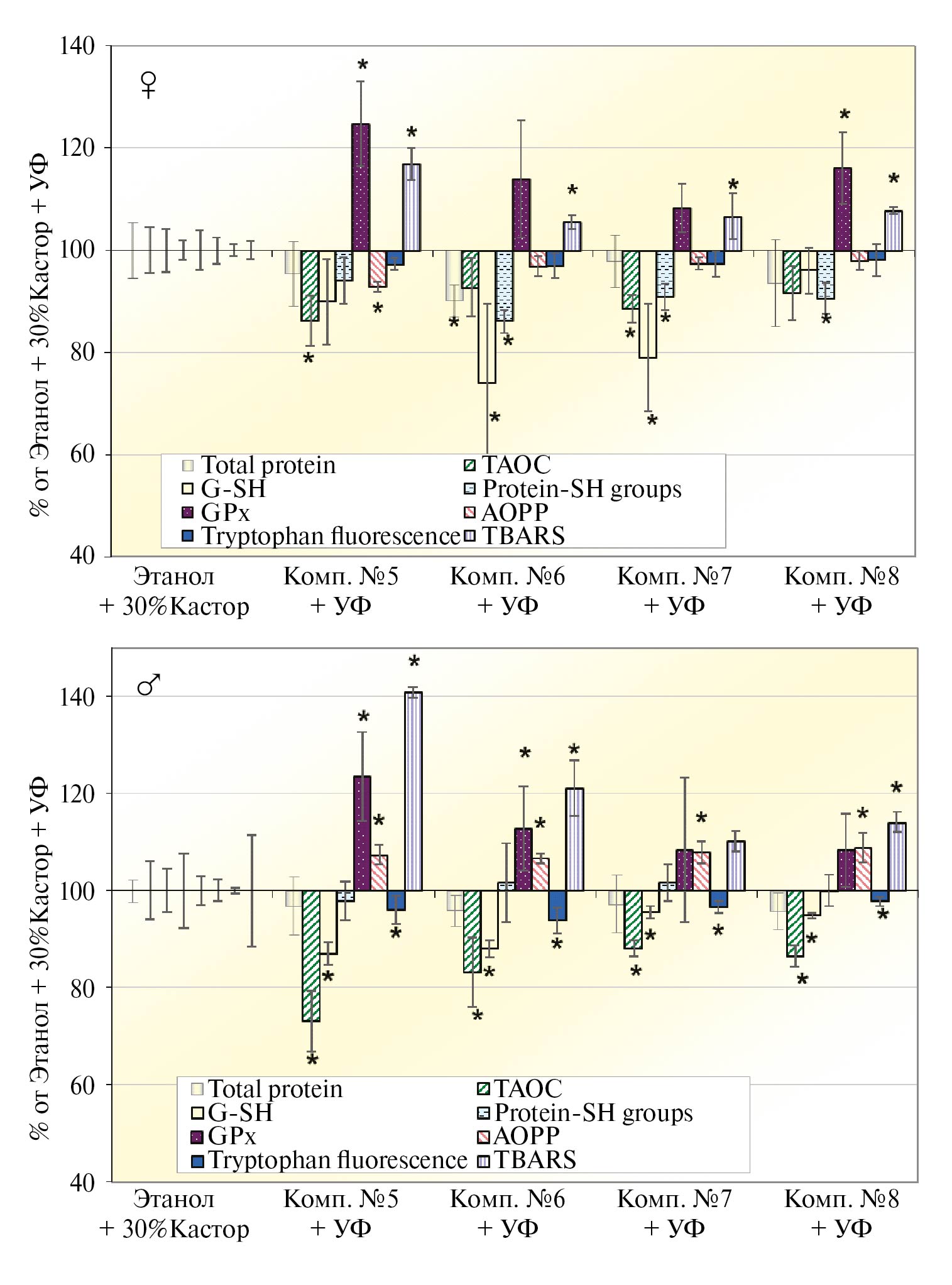 Анализ биохимических параметров сыворотки крови (рис. 6), как и в случае этанольных композиций, для этанольно-касторовых композиций в целом не показал дальнейшего понижения уровня белка относительно группы “30% кастор. масла в этаноле +УФ”. Исключением стала композиция № 6 у самок — хотя величина и составляла около 10%, его снижение было значимым.