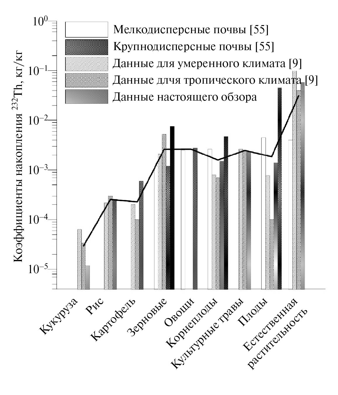 Поведение тория в наземной среде во многом определяется его низкой подвижностью в почве. Органические почвы характеризуется наименьшими коэффициентами перехода, а песчаные, суглинистые и глинистые почвы существенно не отличаются друг от друга. Эта закономерность несколько отличается от того, что можно было бы ожидать на основе данных по Kd, и позволяет предположить, что другие факторы, такие как pH почвы, тип растительности и особенности технологии возделывания сельскохозяйственных культур, также оказывают большое влияние на поступление тория из почвы в растения. Учитывая низкие значения коэффициентов накопления, важное значение с точки зрения переноса тория по пищевым цепочкам имеет внекорневое загрязнение растений частицами пыли или почвы. Наиболее высокие значения коэффициентов накопления (более 1.0×10–2) отмечаются для дикорастущей травянистой растительности, а наиболее низкие значения (10–4-10–5) характерны для кукурузы, зерна риса и клубнеплодов. Овощи, зерновые и фрукты занимают в этом ряду промежуточное положение. Механизмы корневого накоплении растениями изотопов тория 228Th, 230Th и 232Th существенно отличаются, что определяет необходимость учета вклада предшественников в цепочках распада 238U и 232Th при оценке Кн этих изотопов растениями. Коэффициент накопления, основанный на предположении о наличии линейности между концентрацией радионуклидов в растениях и почве, является наиболее простым подходом к оценке поступления радионуклидов в растения и не учитывает ряд важных закономерностей, определяющих содержание тория в растительности.