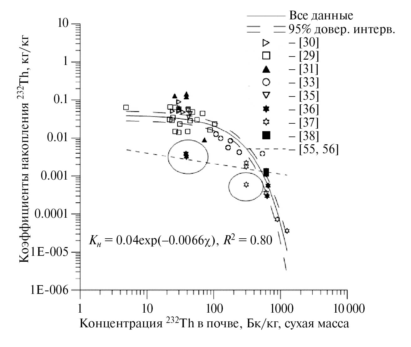 Представленные результаты позволяют сделать вывод, что зависимость Кн от концентрации тория в почве носит нелинейный характер, что ограничивает непосредственное обобщение данных без дополнительного анализа. Отметим, что нелинейность коэффициентов накопления, по-видимому, не связана с фитотоксичностью тория и других сопутствующих радионуклидов, так как высокие значения Кн отмечаются и для концентраций тория ниже природного фона.