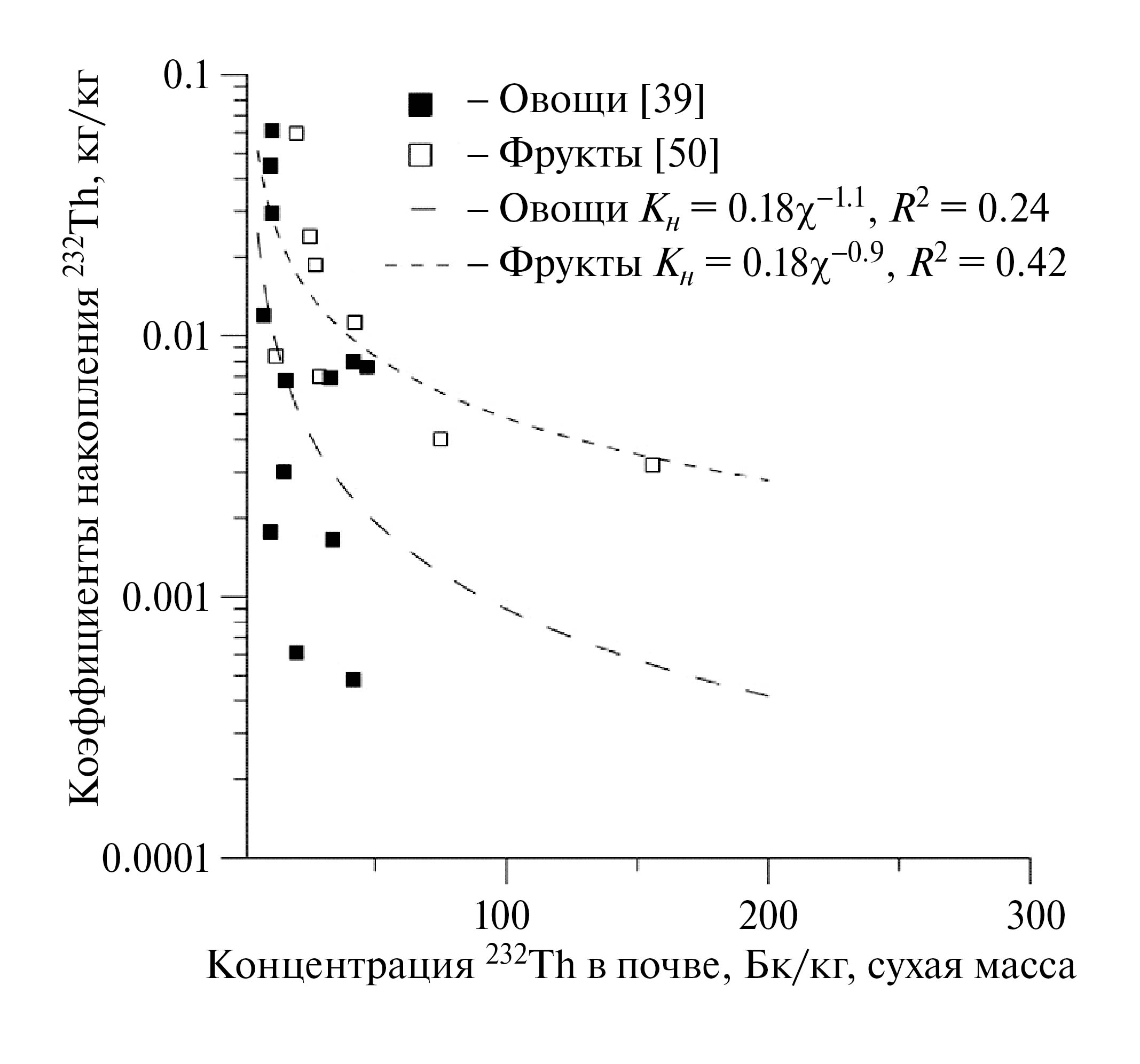 Информации для корректной оценки аналогичных зависимостей для других видов растений недостаточно, а имеющиеся в литературе данные в большинстве случаев ограничиваются диапазоном фоновых концентраций тория в почве. В качестве примера имеющихся данных на рис. 5 приведены зависимости Кн овощами, выращиваемые на участке с содержанием тория от 10 до 50 Бк/кг и фруктами в районе расположения р. Аллигатор (Австралия). Зависимость Кн от концентрации тория в почве в обоих случаях описывается степенной функцией, при этом параметры этих функций для овощей и фруктов довольно близки. В то же время качество аппроксимации этих данных невысоко, так как коэффициент детерминации (R2) аппроксимации этих данных степенной функцией не превышает 0.42.