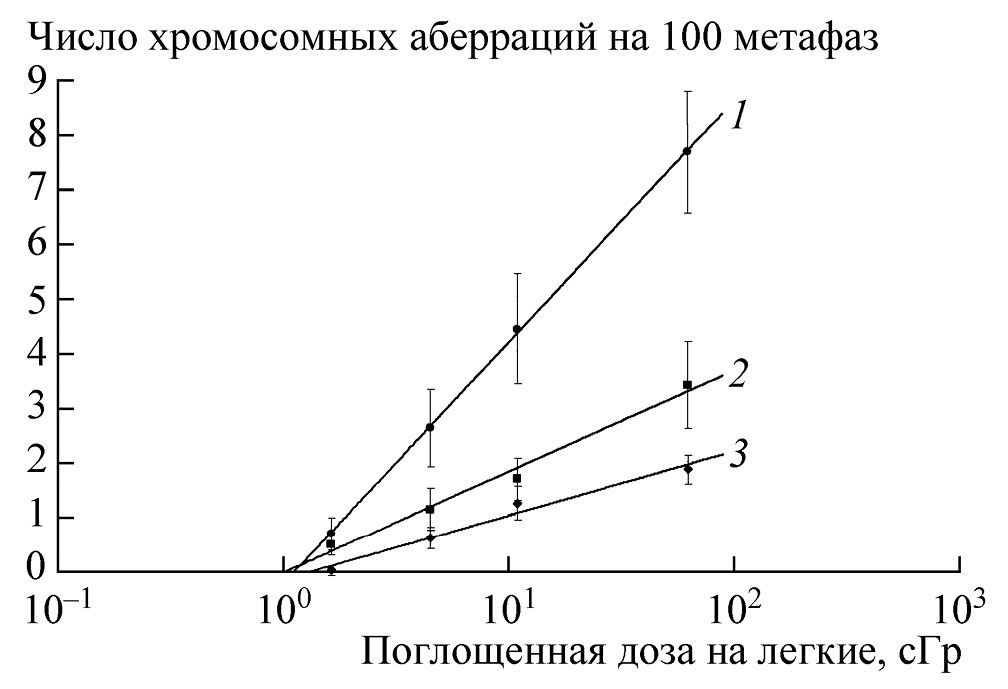 Рис. 1. Зависимость числа аберраций хромосомного типа в лимфоцитах периферической крови человека от поглощенной в легких дозы α-облучения (1 – суммарное число аберраций, 2 – стабильные аберрации, 3 – дицентрики).
