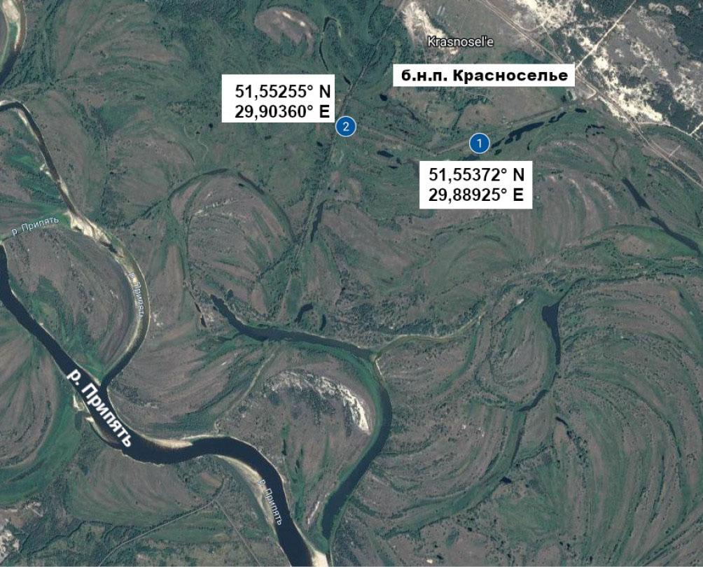 Рис. 1. Расположение реперных участков № 1 (51.552553° N 29.903605° E) и № 2 (51.553727° N 29.88925° E) в пойме р. Припять.