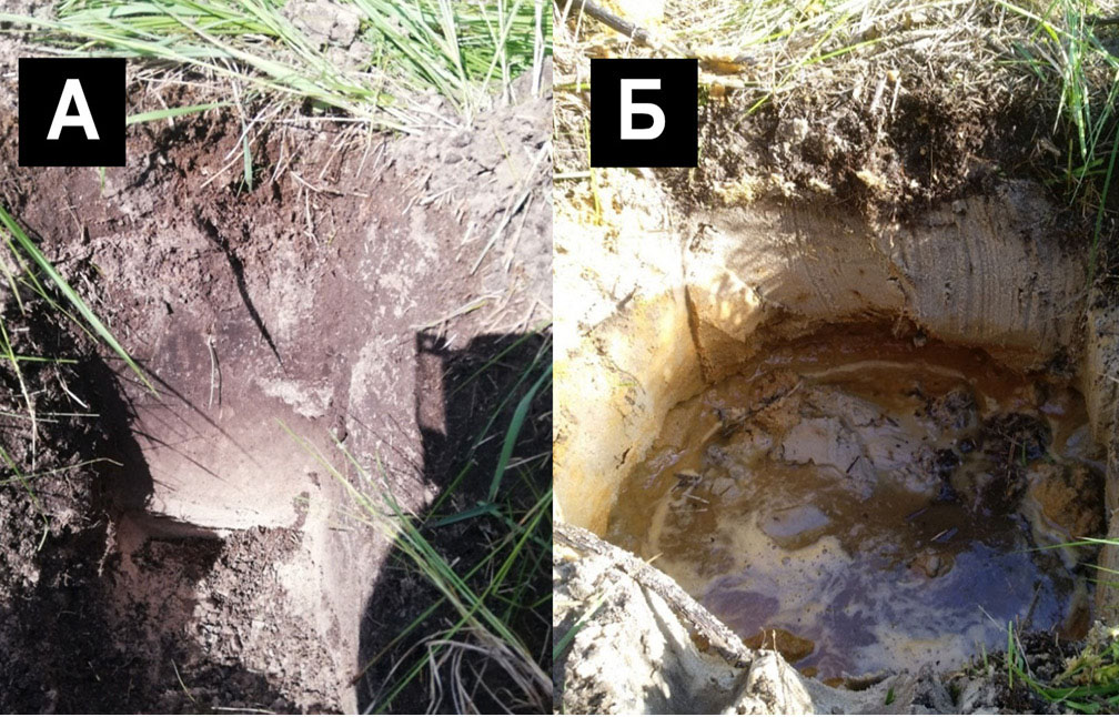 Рис. 2. Фотографии почвенных прикопок на реперном участке № 1 (А) и репереном участке № 2 (Б).