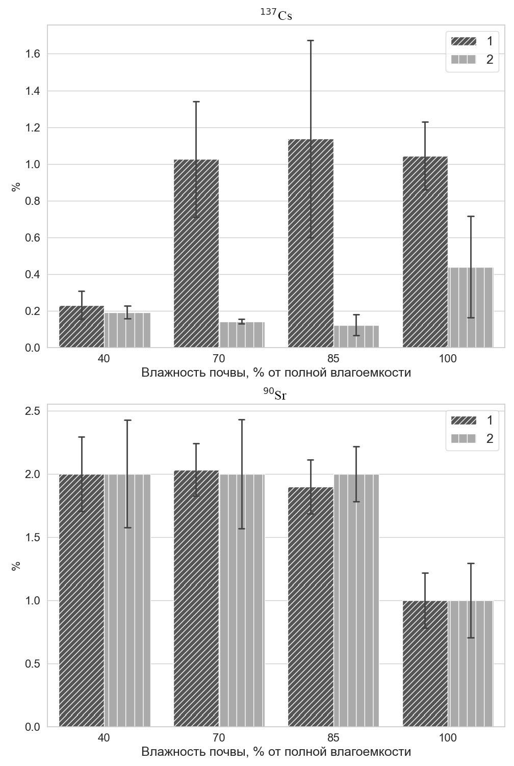 Рис. 4. Влияние влажности почвы на долю ¹³⁷Cs и ⁹⁰Sr в ионообменной форме в дерново-глееватой на супесчаном аллювии почве (1) и дерново-глеевой на песчаном аллювии почве (2). Планки погрешностей – стандартное отклонение.