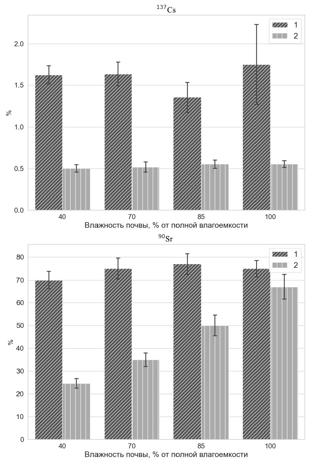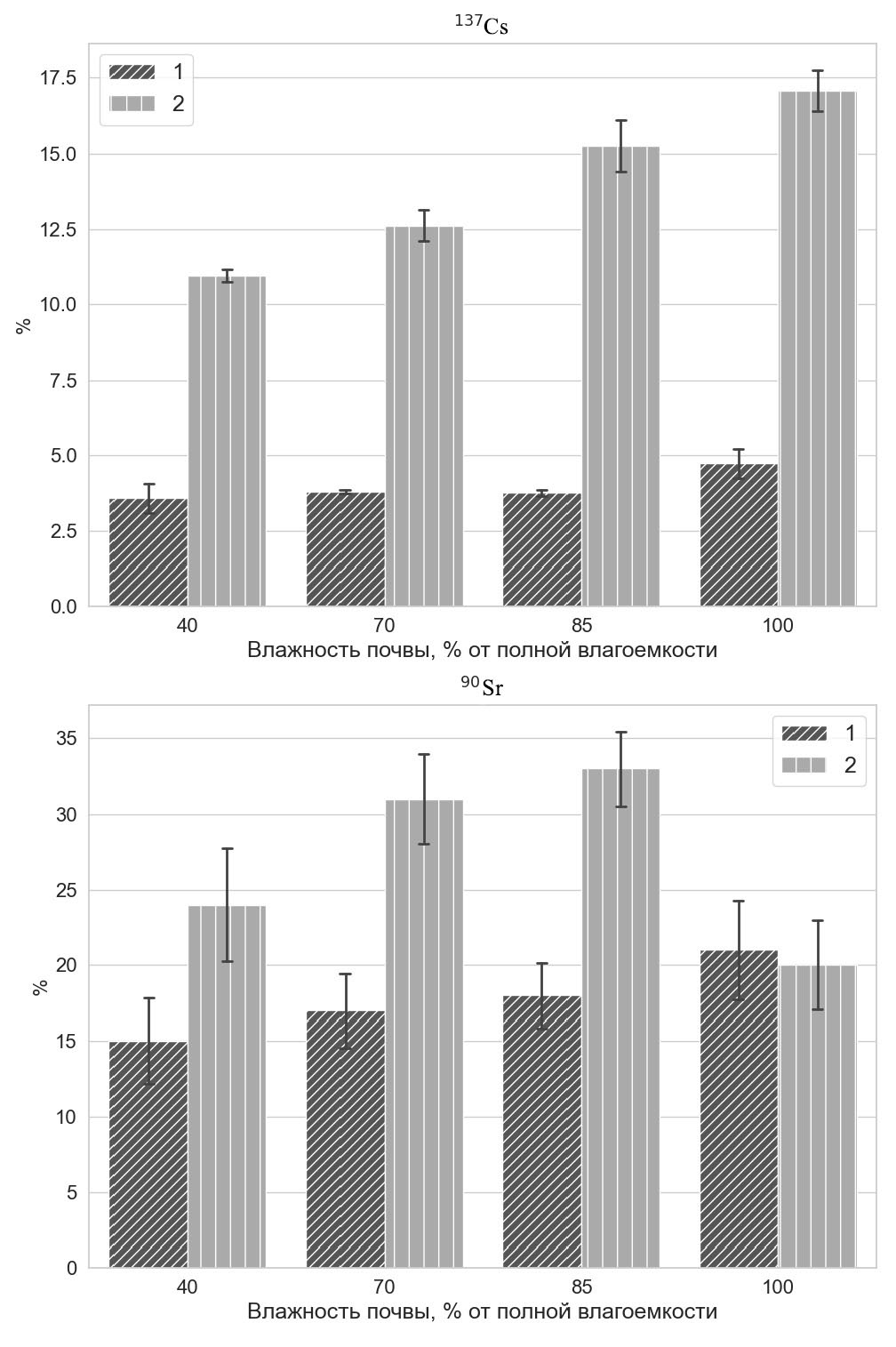 Fig. 3. Effect of soil moisture on the share of water-soluble ¹³⁷Cs and ⁹⁰Sr in sod-gleyed soil on sandy-loam alluvium (1) and sod-gley soil on sandy alluvium (2). Error bars are standard deviation.