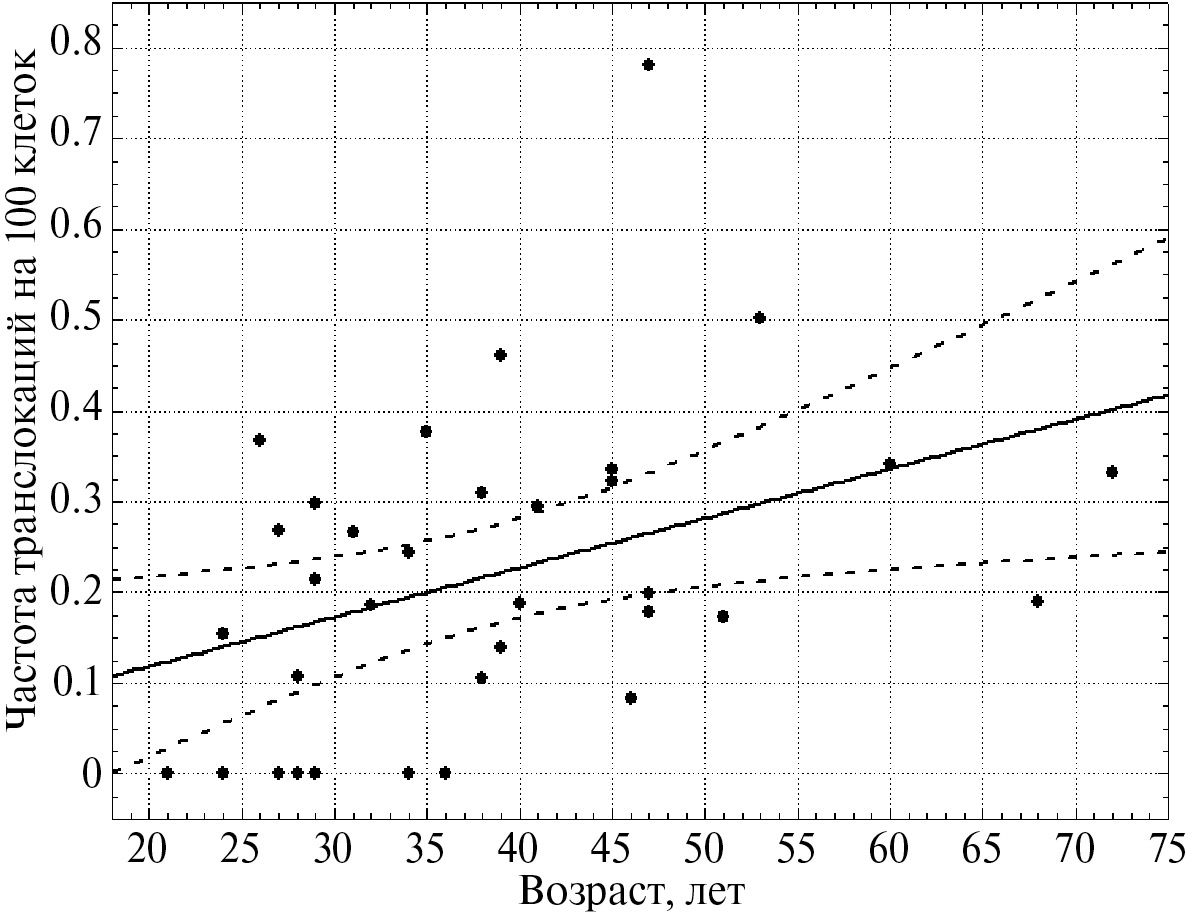 Таким образом, в соответствии со шкалой Чертока (см. [17]) наблюдается корреляционная связь умеренной силы между фоновым уровнем FISH-транслокаций и возрастом доноров в диапазоне от 21 до 72 лет.